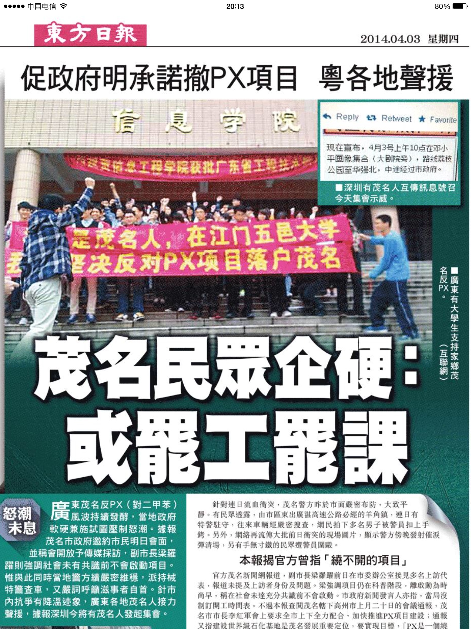 [茂名市教育局]:这个问题由我来回答。事件发生以来,我们市各级教育主管部门和学校积极采取应对措施,从维护学校的正常教学秩序和学生的人身安全角度做了大量的工作,整个教育系统广大的师生保持稳定,3月30号确实有少数的学生出于好奇的原因在现场围观,经我们教育引导后离开,我们也坦诚的说明一点,确实有极个别的学校在PX项目科普阶段工作方法欠妥,引起了一些学生和家长的误解和反感,今后我们会更加以人为本,做好各项工作,确保广大师生和家长的情绪稳定,维护学校的正常教学秩序和师生的安全。[15:56]