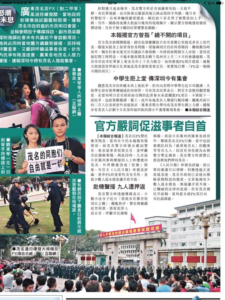 [茂名市政府]:第三,在项目普及知识阶段,部分群众表达了对这个项目的关切。在这次事件中,绝大多数表达诉求的群众是理性平和的。广大人民群众对芳烃项目所表达的关切和意愿,充分体现了大家对茂名的无比热爱,对茂名未来发展的深切关注,与市委、市政府的工作和愿望是完全一致的。但在事件中,极少数不法分子编造谣言、借机闹事,采取打砸烧等暴力手段破坏市政设施,扰乱社会秩序,危害公共安全,既违反了国家法律,又严重背离了广大群众理性表达对芳烃项目关切的初衷。对这些违法行为,公安机关必将依法严厉打击。[15:51]