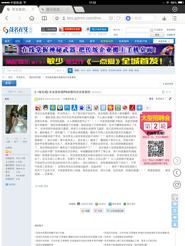 看上面一帖被删的动作就知道网站是否有收到指示压力,当然该网友有煽动散步实在不该,我们需要理性对待,需要政府正面回应,但拒绝政府五毛忽悠