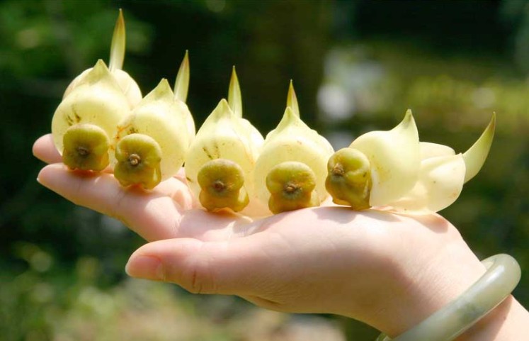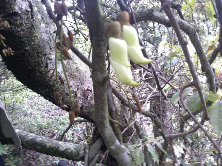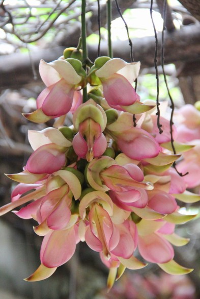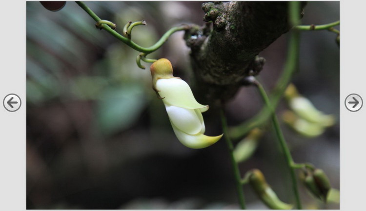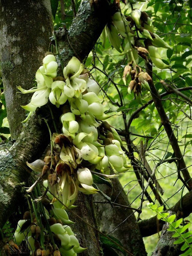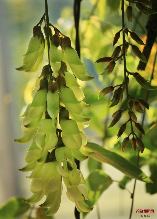 禾雀花,学名白花油麻藤,属蝶形花科,是中国国家二类保护植物。禾雀花外形奇特,花开四(五)瓣,花托似禾雀头,两旁各有一粒似眼睛的小黑点,正中的一瓣,弯弓似雀背,两侧的花瓣似雀翼,底瓣后伸,是为尾巴,花内有一撮细长略弯的花蕊,人们称之为“禾雀内脏”。禾雀花初开时为翡翠绿色,盛开时为柠檬黄色,非常漂亮。它又有着各种惟妙惟肖的动作造型,且“受伤”时还会“流血”,可谓植物界的奇珍异品。禾雀花开在长长的藤蔓上,吊挂成串,每串二十至三十朵不等,串串下垂,游人远远望去,似是百鸟栖枝,雀跃花香,令人叹为观止。