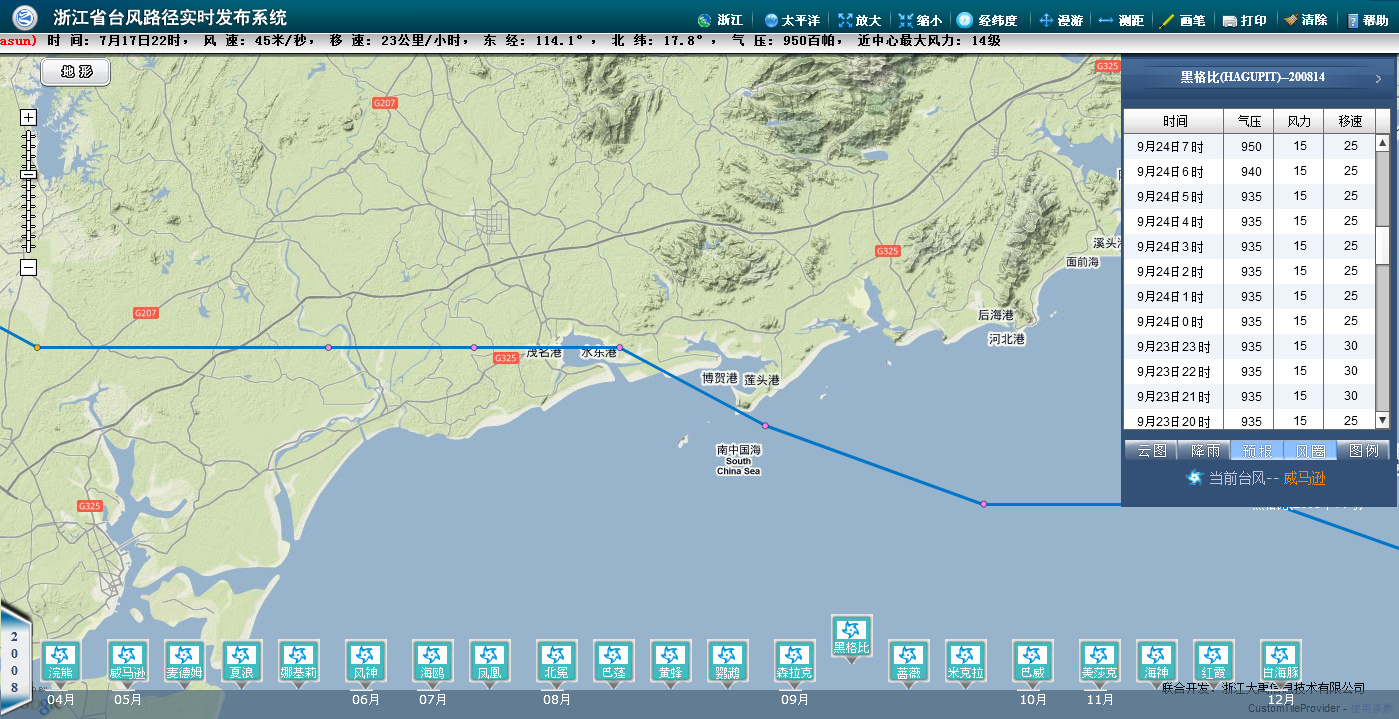 白色孔布 博士生 注册 2006-03-29 消息 1,226 反馈评分 1 点数 61 2014-07-17 #39 2008年“黑格比”与今年“威马逊”路线对比图: [attachmentid=330106] 附件 浙江省台风路径实时发布系统.png 516.5 KB · 查看: 470