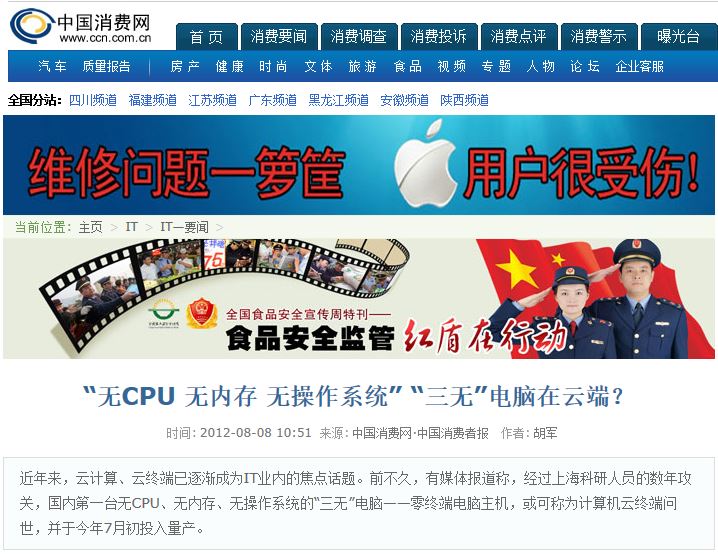 有一种人就是喜欢自取其辱,我“告诉你现在有种云终端”,什么叫“有种”,象你这种有资格认美国人当干爹的中国人,只是中国人中的一种,你这种是当汉奸的”种“,你那种“533MHz嵌入式低功耗CPU”是什么CPU知道吗?,知道533MHz是什么意思吗?搭客时摩托车轮能转多少Hz知道吗?我自己的电脑CPU用3GHz的我都嫌它慢,533M还不到1G,知道这种有CPU的云终端,它用这么慢的CPU起什么作用吗?