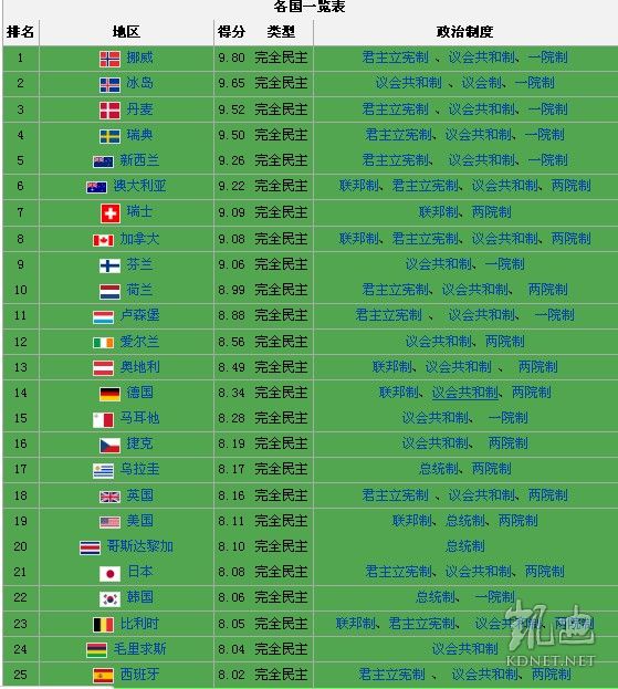 世界民主国家图表,个人感觉这些国家都是党国高官、有识之士、忽悠我们反民主的二货、富人移民的首选地,好不好各位看官自己评判!