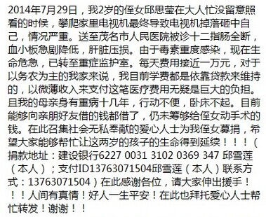 M ming5500828 小学一年级 注册 2008-05-30 消息 104 反馈评分 0 点数 1 2014-08-01 #1 2014年7月29日,我2岁的侄女邱思莹在大人忙没留意照看的时候,攀爬家里电视机最终导致电视机掉落砸中自己,情况严重。送至茂名市人民医院被诊十二指肠全断,血小板急剧降低,肝脏压损 ... 附件 1.jpg 25.1 KB · 查看: 263 2.jpg 45.8 KB · 查看: 273 4.jpg 52.4 KB · 查看: 263 34.jpg 39.6 KB · 查看: 262 5.jpg 74.2 KB · 查看: 279