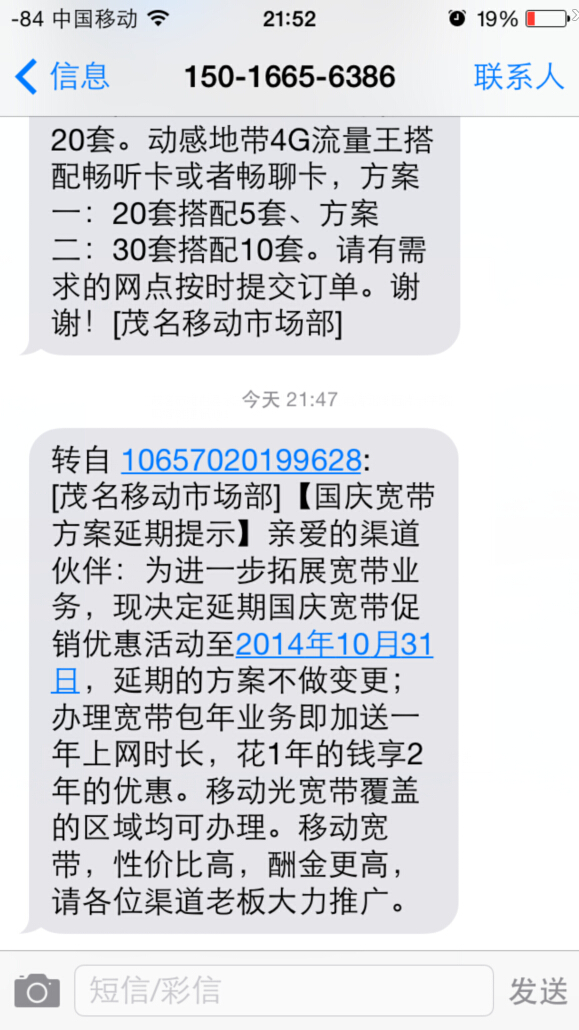 中国移动光宽带迎国庆新装或续费一年赠送一年和赠送话费活动已经进入完美收官截止阶段,明天仍旧可继续受理活动期中国移动光宽带优惠方案,如需要报装或续费请及时联系报装了解咨询。具体截止日期届时准点公布!!