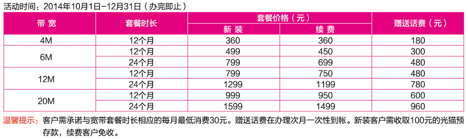 第一档:4M只需360元/年,送180元话费+加赠1年光宽带免费使用。续费360元