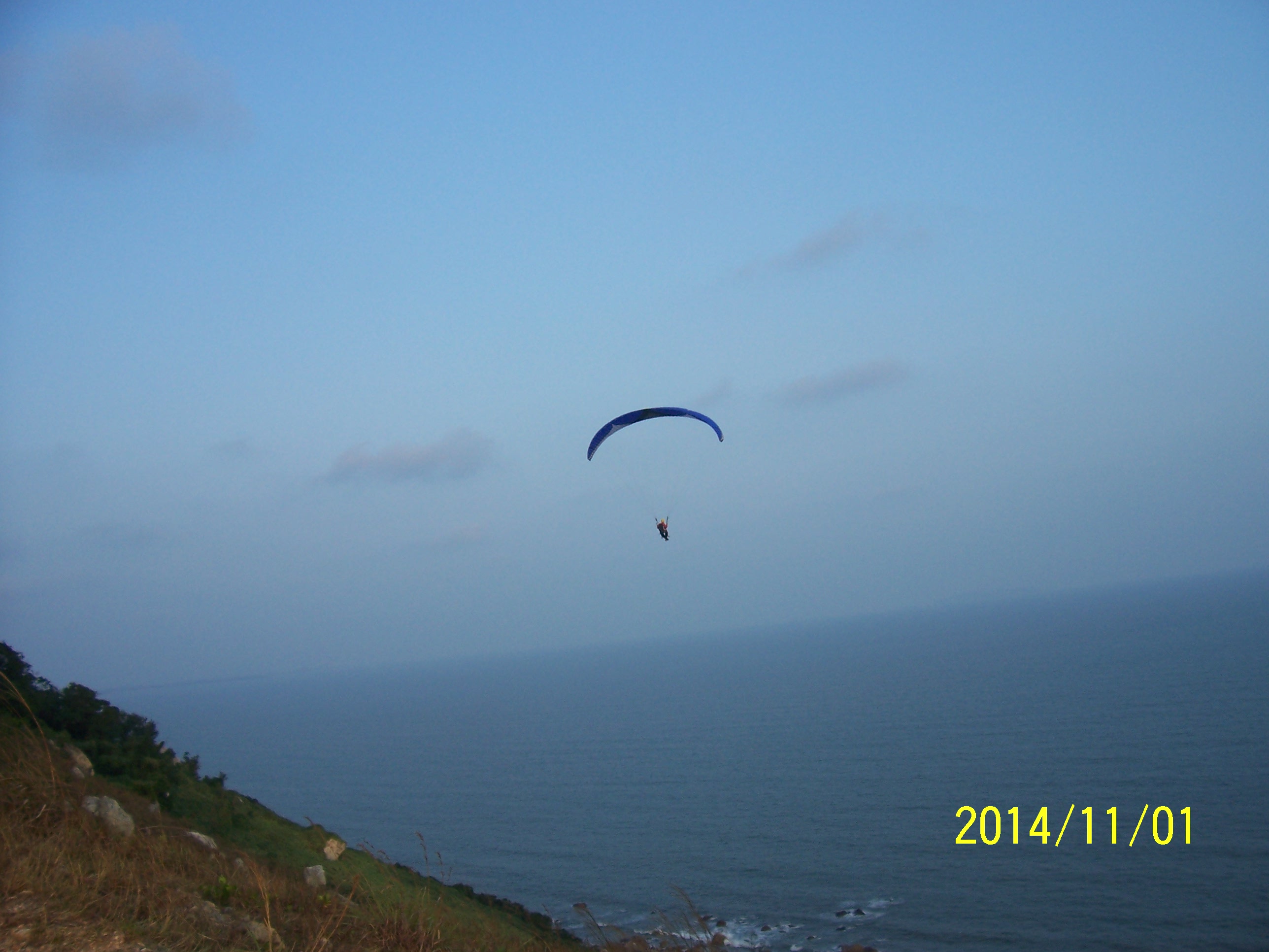 下午试了好久,他终于在助手的协助下,成功地带着孩子在山上海面上下来回飞翔,见者无不惊叹!