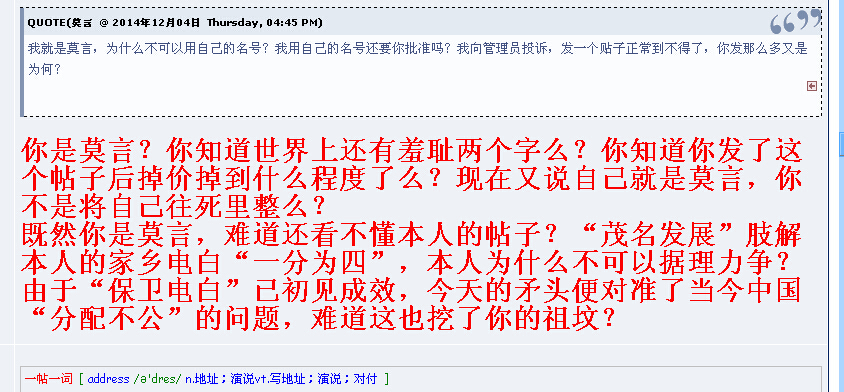 初悟人生 大学三年级 注册 2010-07-13 消息 858 反馈评分 0 点数 0 2014-12-05 #44 QUOTE(湖海山人 @ 2014年12月04日 Thursday, 09:06 PM) 我没孔婆的气量. 本来我计划在十周年后湖海山人这个ID就淡出论坛的。 [snapback]3720004[/snapback] 这句话说明什么问题?说明自己的丑陋的灵魂还是心怀坦荡?相信除了反映个人妒忌与复仇的心理外,再也难以有其他的用途了。 [attachmentid=335408] 附件 莫言的无耻.jpg 40.6 KB · 查看: 296