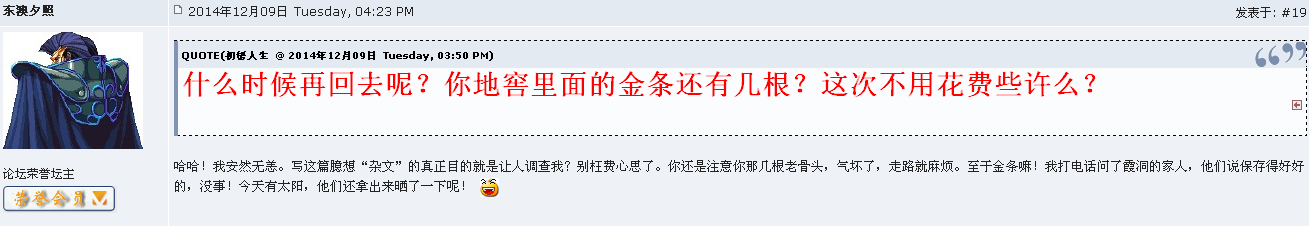 东澳夕照 论坛荣誉坛主 荣誉会员 注册 2005-04-02 消息 11,507 反馈评分 87 点数 71 所在地 广东电白 性别 男 2014-12-11 #67 QUOTE(七九工 @ 2014年12月11日 Thursday, 01:21 PM) 大师发帖的动机是积极的,大师的水平是高的,但老夫子的风格人家是不敢恭维的! [snapback]3721698[/snapback] 太积极了,头版全是他的贴,常被禁言,还有个ID故意破坏论坛秩序,被永久封停。他不服版主,换了马甲按原来那套继续捣蛋,这就是他的人品。