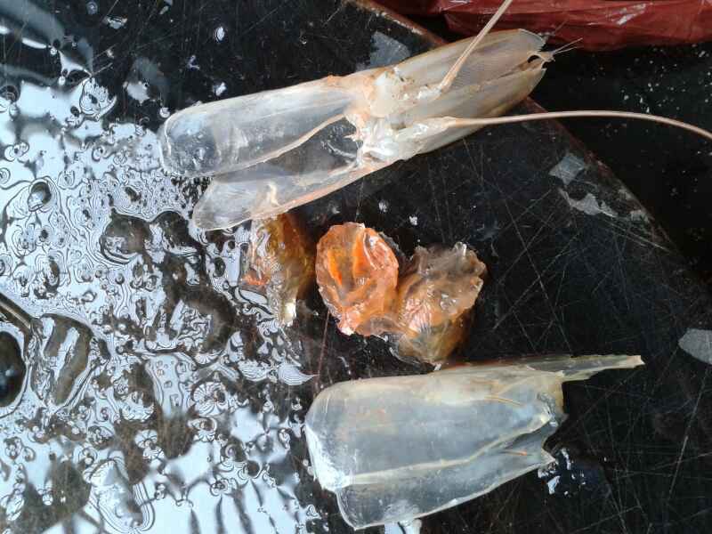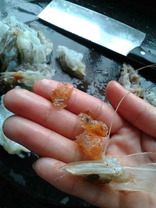 今天花了几十块钱在上排市场买了斤虾,新鲜个大,回家剥开,发现每个虾头虾肉都掺和着有透明的物体,起初还以为是虾卵,后来发现每条都有,不对劲了,上网查看,吓人呀!是网上说的那些注入保鲜剂的虾吗?这大过年的,商家,贩子良心何在!付图.