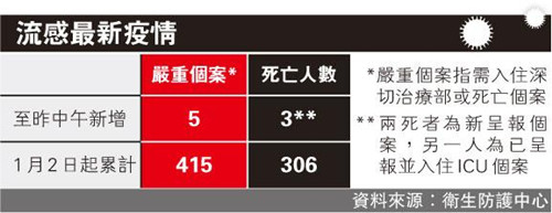 据香港《明报》报道,香港流感持续肆虐,1日再夺3命,累计死亡人数达306人。