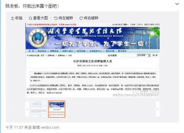 又查到:长沙市国保支队招聘临聘人员信息。其联系人:陈队长。电话为:13707496399
