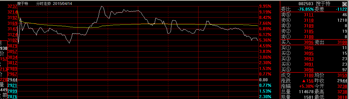 QUOTE(司空苍雪 @ 2015年04月13日 Monday, 09:20 PM) 2015年4月09日买了两股, 短线000656,中线钢铁股000717。 短线的只有升5%左右,(赚得少不好意思公开)中线000717已超过20%(3天小赚5万元人民币)明天走人了。 富安娜002327 搜于特002503这个两股不一定能升,属个人爱好,不喜勿喷。 [snapback]3744086[/snapback] 昨天买了今天小升5%和6%