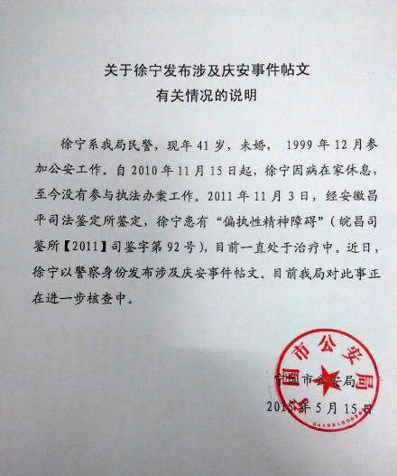歌功颂德 荣誉主席 注册 2009-11-04 消息 4,833 反馈评分 95 点数 71 2015-05-16 #45 安徽一民警发帖质疑庆安枪案,当地警方称其患精神病停职多年 附件 22.jpg 84.9 KB · 查看: 337