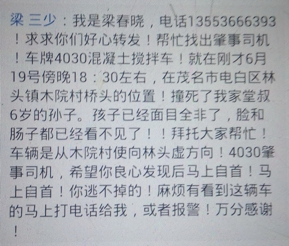 6月19日19时左右,一辆搅拌车在林头木院桥头辗死一小孩何某(男,7岁)。发生事故后,肇事司机驾车离开现场。当晚21时,肇事司机刘某到交警宿车中队投案接受处理。目前,电白公安交警部门已对肇事司机刘某依法刑事拘留和查扣肇事车辆,事故善后工作正在处理中。