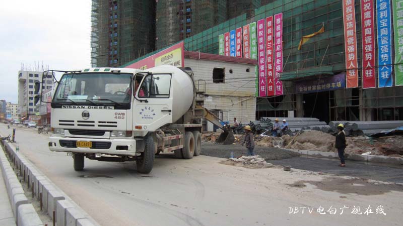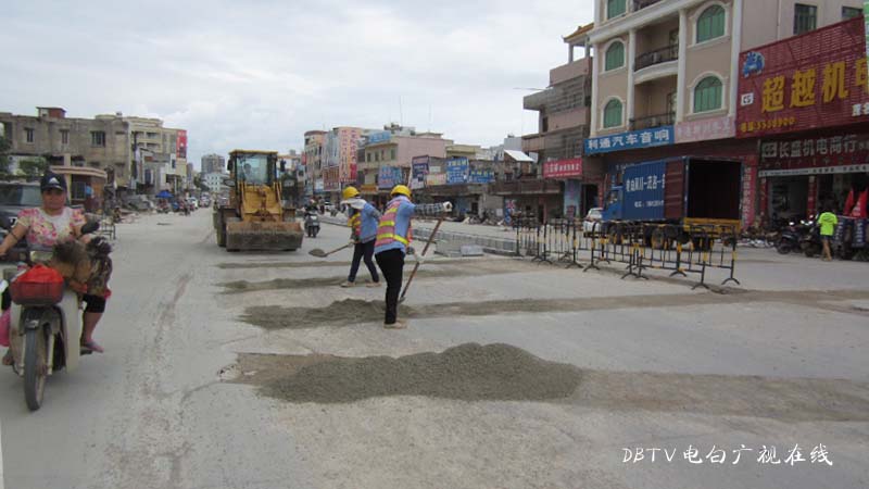路上有工人在用沙土填补坑洼地段,为混凝土路面喷水。