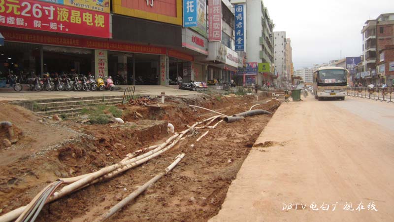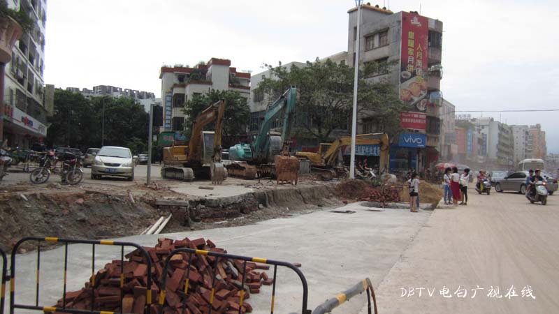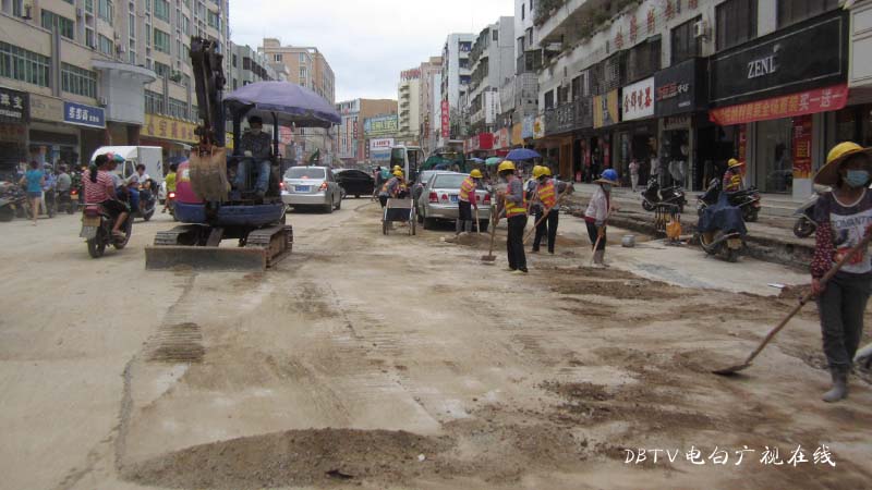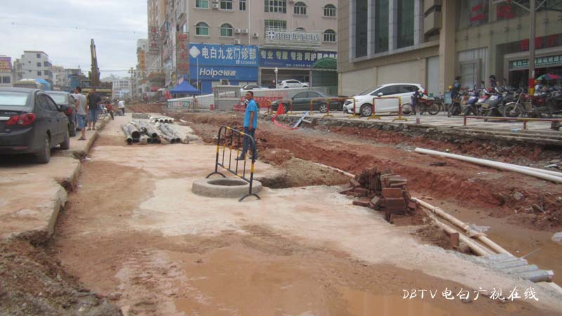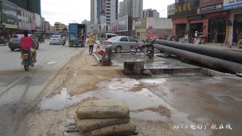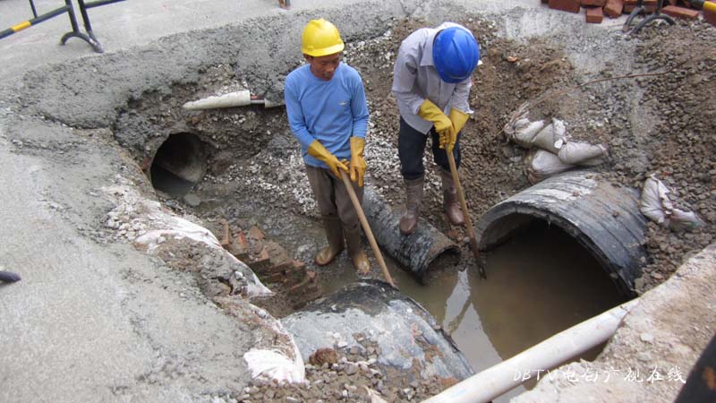 而在水东加油站至中心台段,也有了新的进展,糖果厂路口已经铺好第一层混凝土层,工人们正在排污口清理管道里的淤泥,为下一步施工做准备。而小编观察到这一段的管道更加复杂,许多管道依然裸露在外,大量机器设备和工人正在加紧施工。