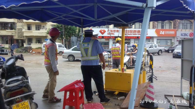 在水东加油站路口,两个尽职的交警在引导车辆行驶,路口交通通畅。