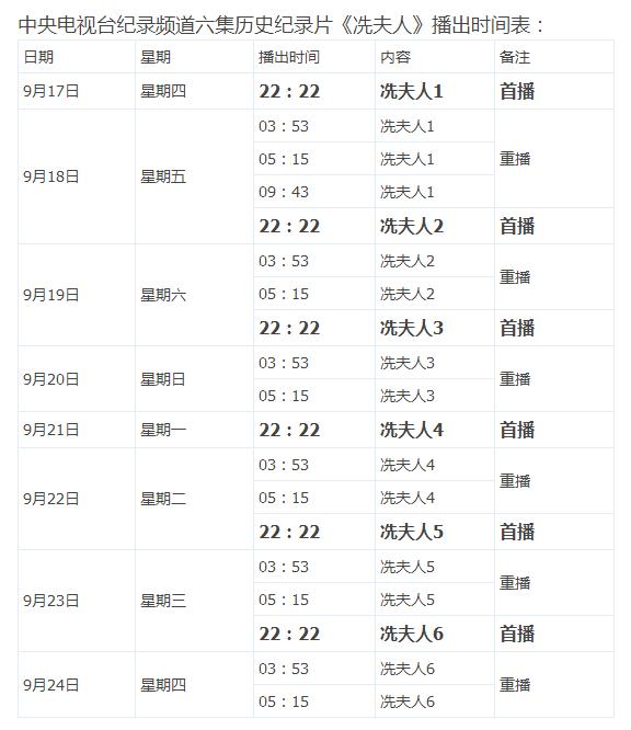 中央电视台纪录频道六集历史纪录片《冼夫人》播出时间表: