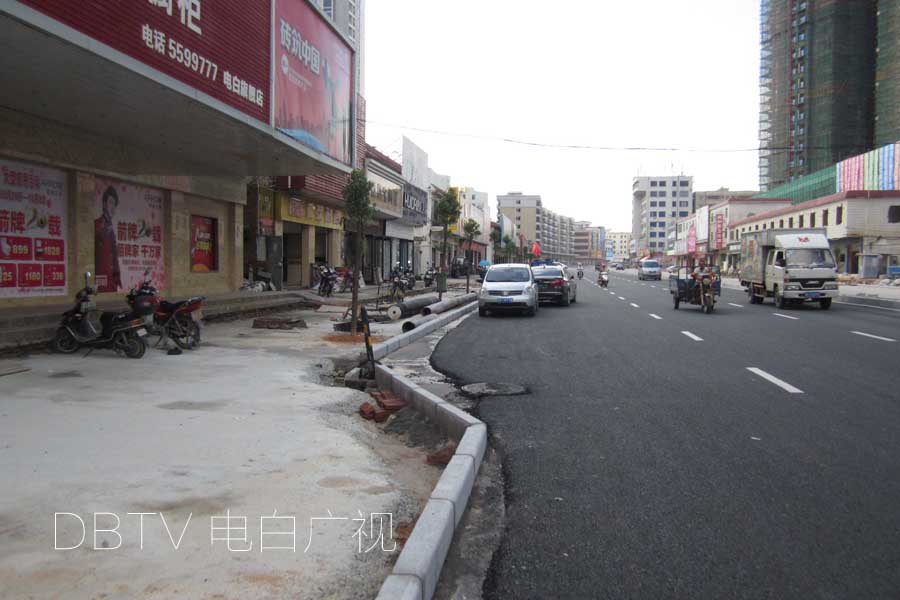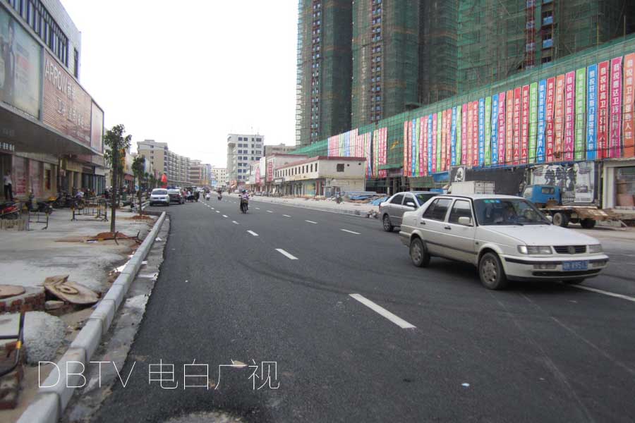 树木的种植,除了某些路段未种植外,东面人行道的树木已经种植到了水东中队路口,西面种植到了厂前路口。