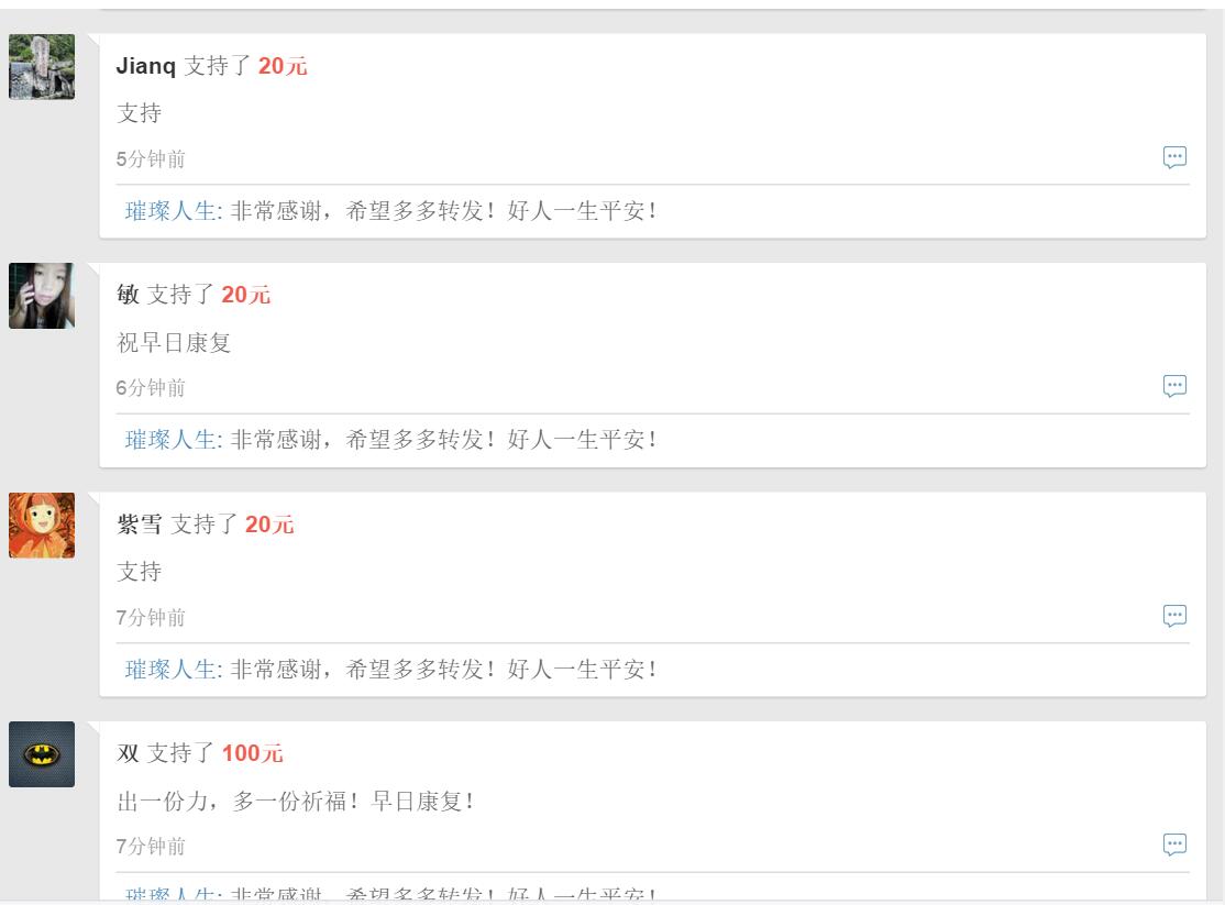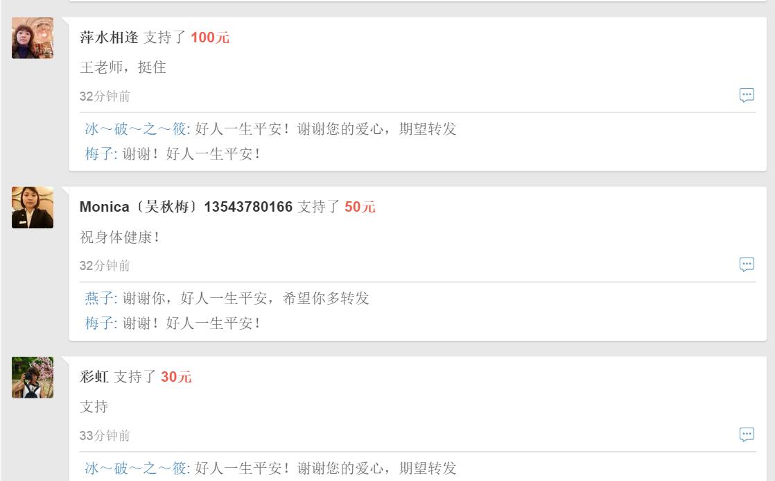 众筹平台从早上开通到现在,一共接受了五百多热心人士的捐款,暂筹资金27682.53 电白三中许多老师自发为王老师在自己朋友圈和同学群里转发,还有王旺老师曾经的学生・・・・・・以下是在众筹平台截图 人太多就不一一截了,以下是链接大家都可以进去关注一下。 http://m.qschou.com/project/4c79e852-be1f-...echat&shareto=2