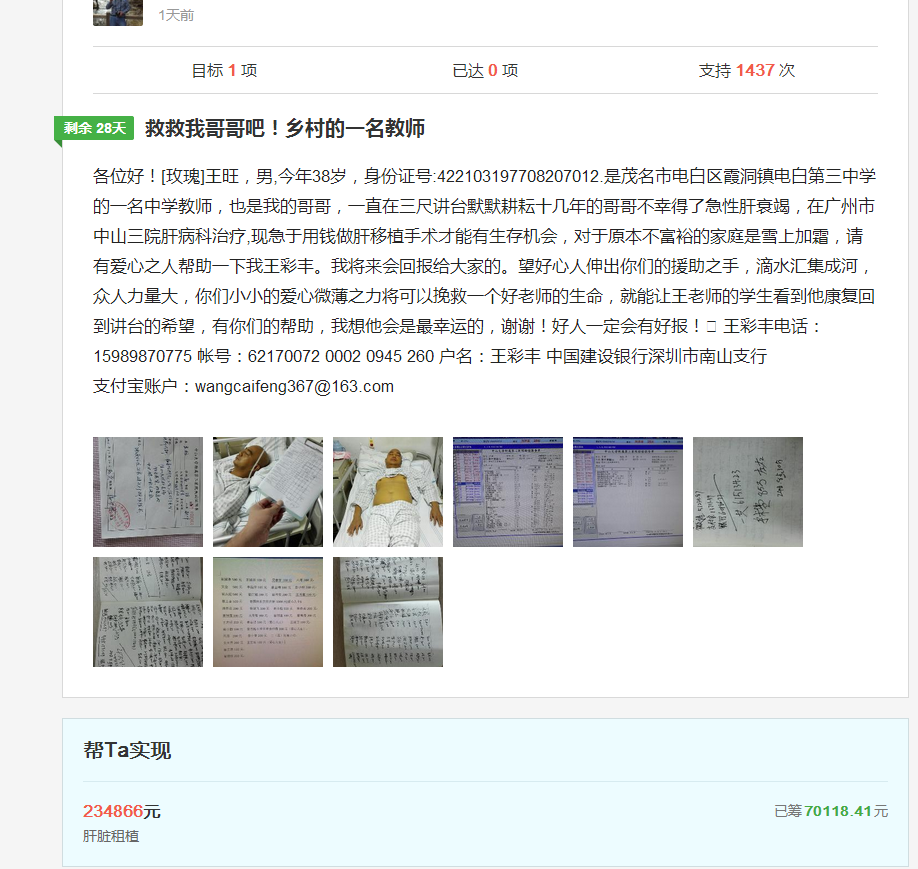 已通过上面发的轻松筹网址进去表心意,不到一天时间筹了一万多,大家的爱心是源源不尽的。不过离60万的费用还相差很大,希望大家继续转发,有钱出钱,有朋友圈就转朋友圈。哪怕是一分的爱,也会聚成拯救的海洋!旺哥挺住!!
