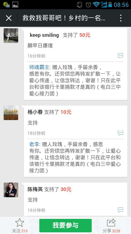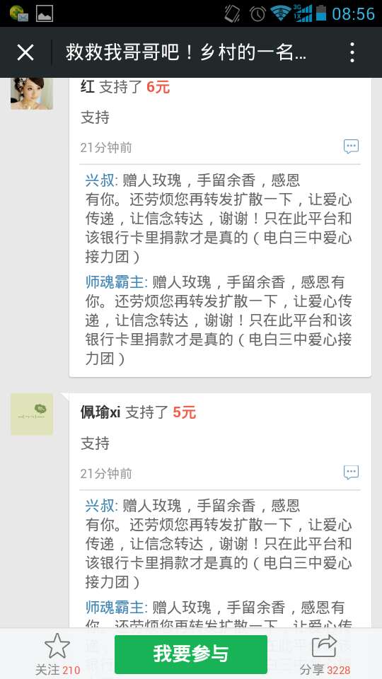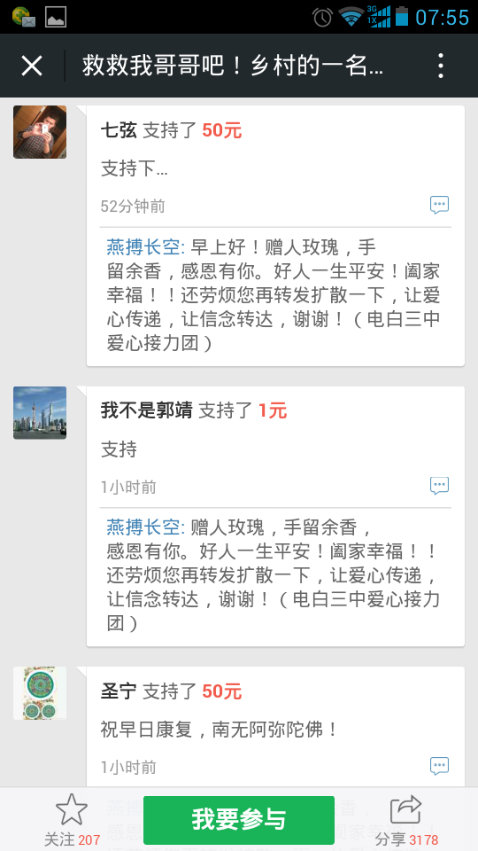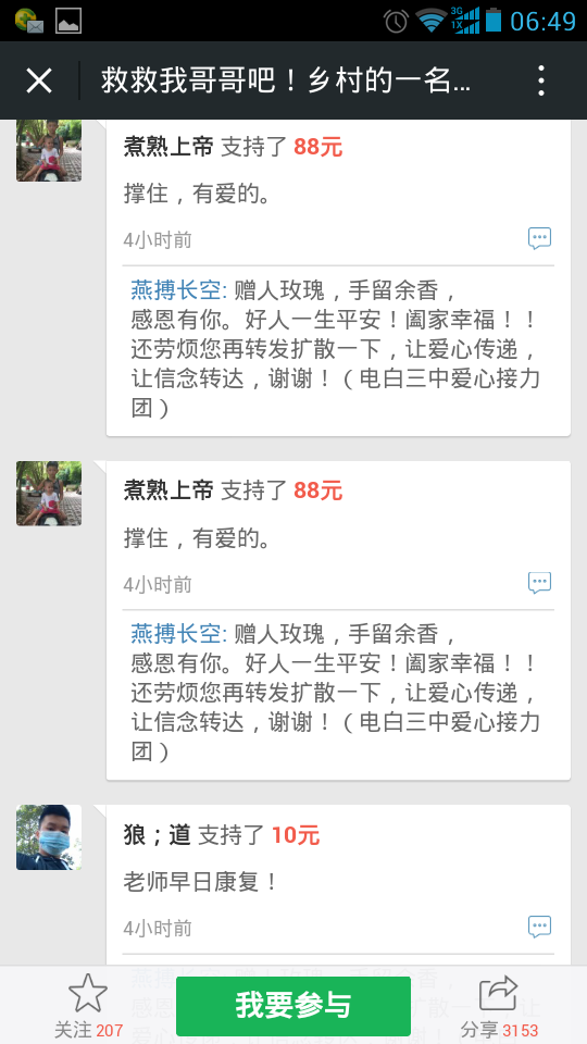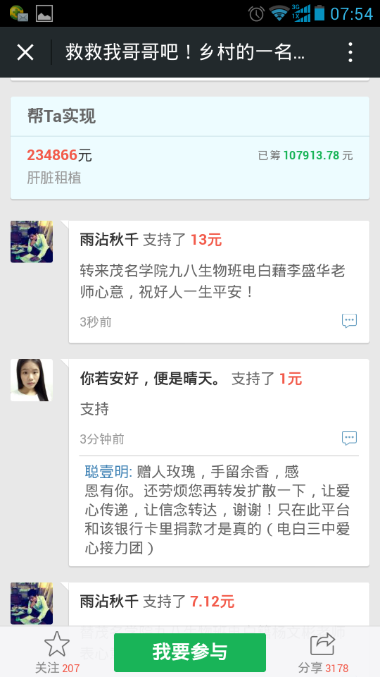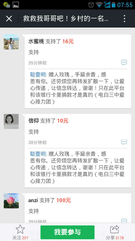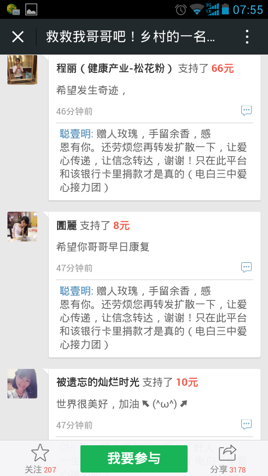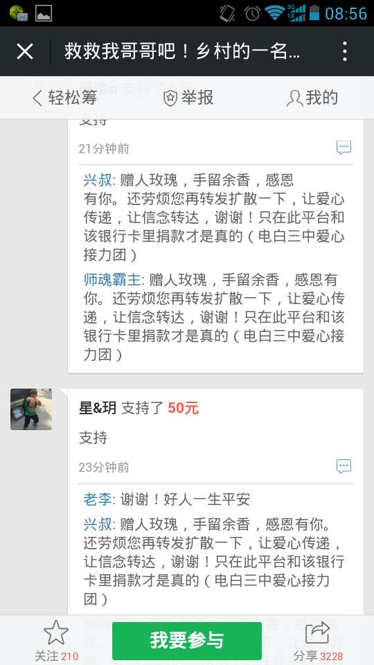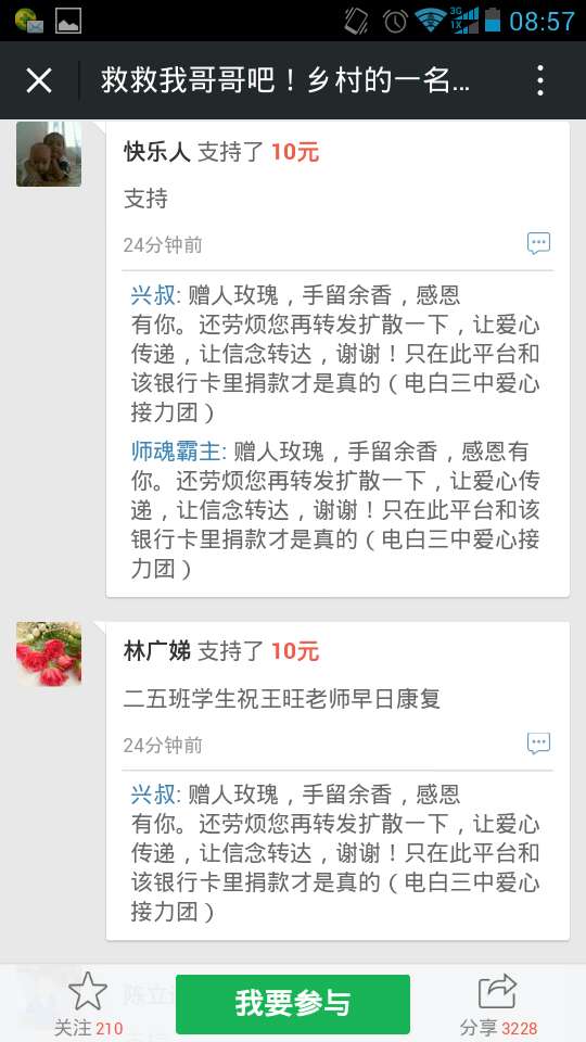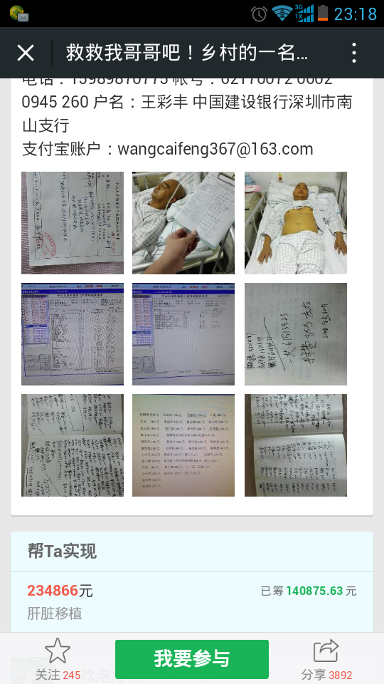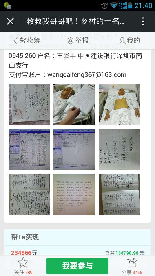 爱心网友接力跑,众募平台已破13万大关!谢谢! 王旺老师的弟弟:王彩丰电话:15989870775 帐号:62170072 0002 0945 260 户名:王彩丰 中国建设银行深圳市南山支行 支付宝账户:wangcaifeng367@163.com 众募平台网址 http://www.qschou.com/project/4c79e852-be1...苯泳杩睿谢谢! 可以在手机直接点击该网址进入捐款的。