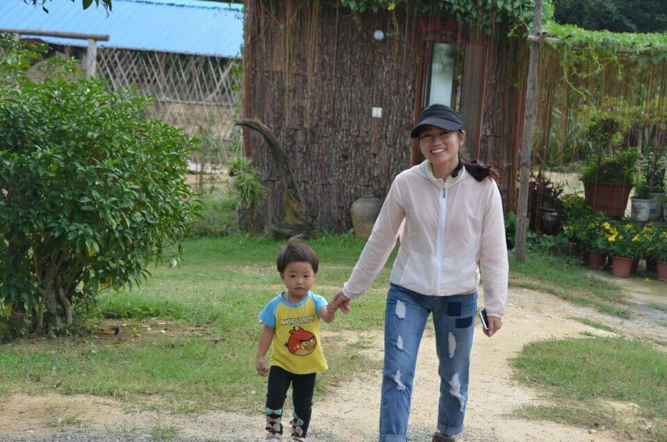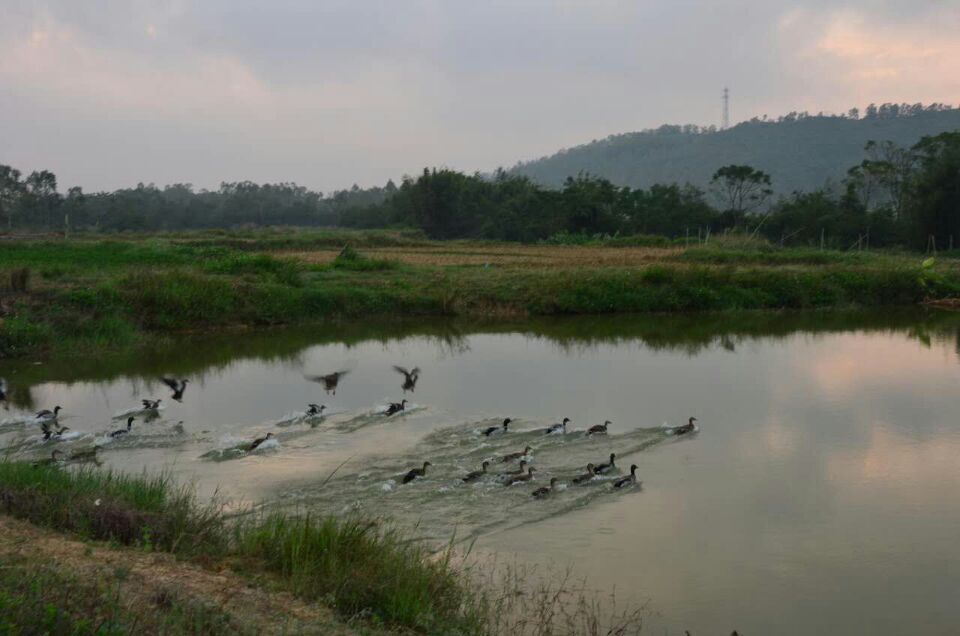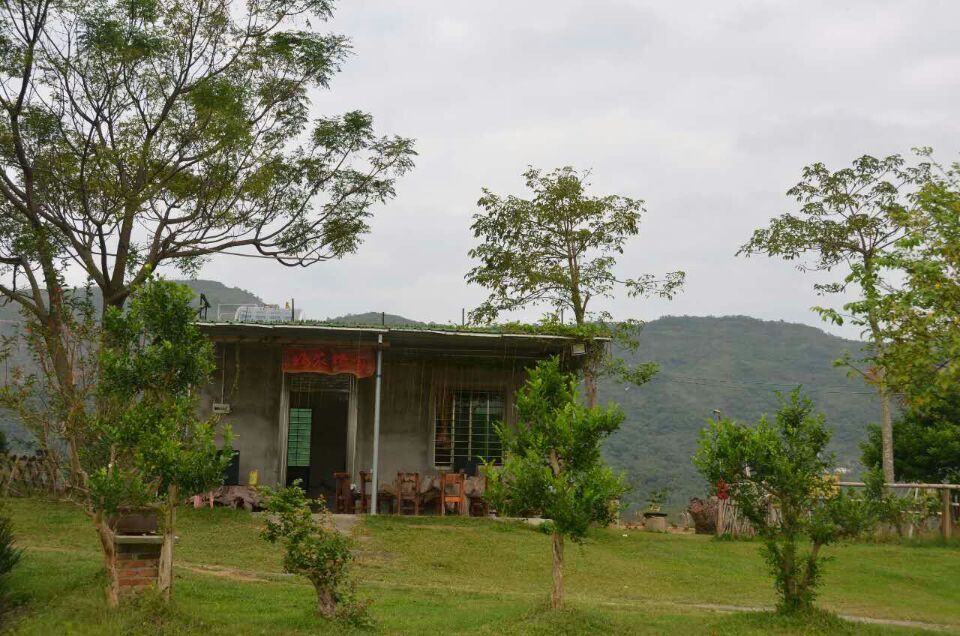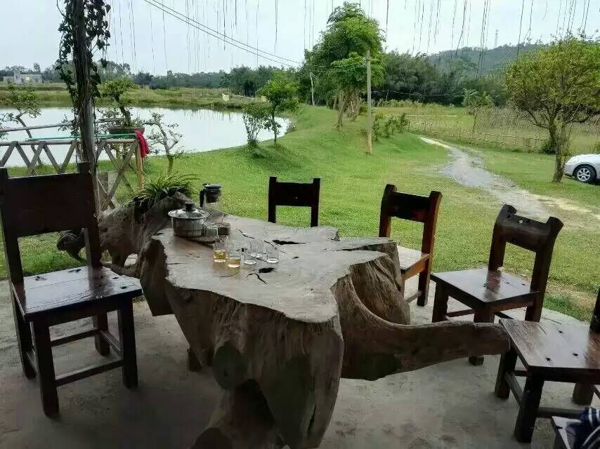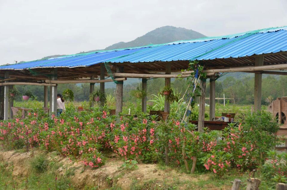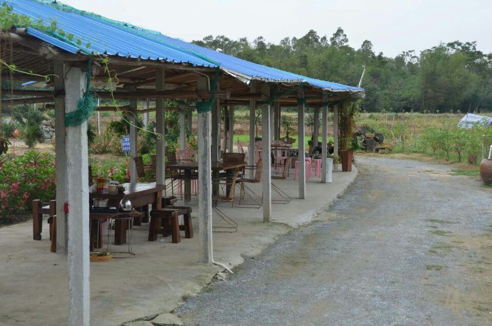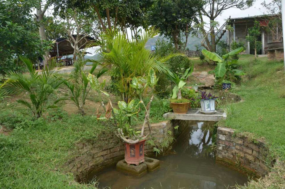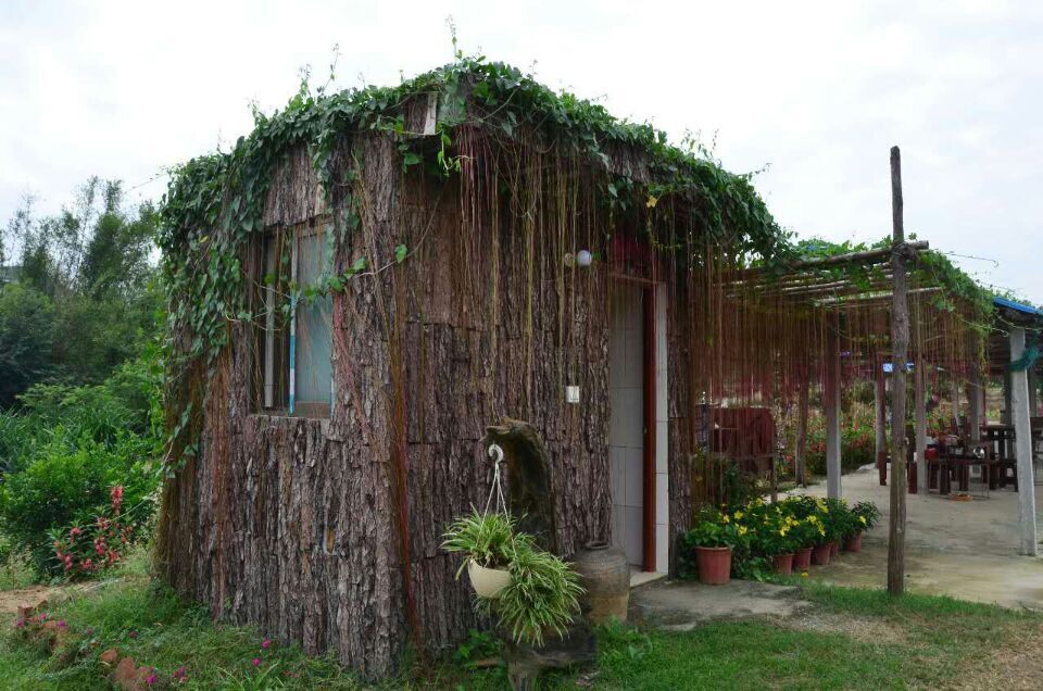 11月14日上午10时半,天气多云,三十多人的大部队齐集水东海景明珠楼下的美利达车铺,整装待发直指电城,30多公里的国道说到就到,途经冼太夫人故地,左转再左转,终于到达电城家桥农庄。农庄座落在一个坡地上,规模不大仅100多亩,背靠山兜村委会凤尾坡村,前面田野开阔,远处是金牛岭,据说该岭因历代民众淘冶砂金,外形似牛而谓称"金牛岭"。停车的草坪旁,一个由花草装点的小屋最引人注目,只见门前一老枯树丫挂着一盆嫩绿的吊兰,墙面贴满杉木树皮,屋顶翠绿的爬藤垂下无数红黄色的丝缕,像凝固在空中的密密雨线,仿佛时光停留在瞬间,仔细一看原来是洗手间,农庄为解决大家后顾之忧可谓费尽心思,小处见大,我也不禁暗暗佩服庄主的匠心独运。