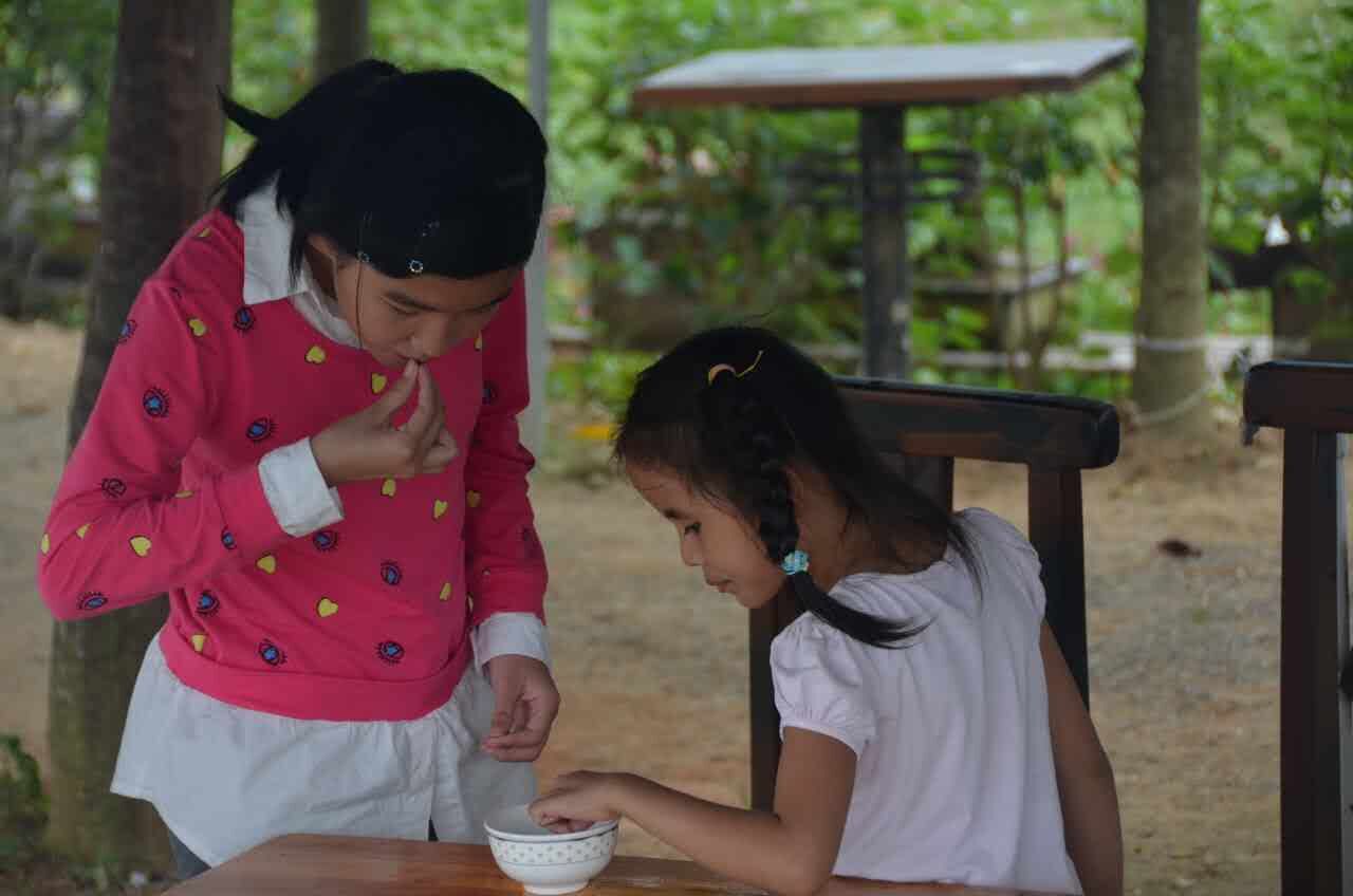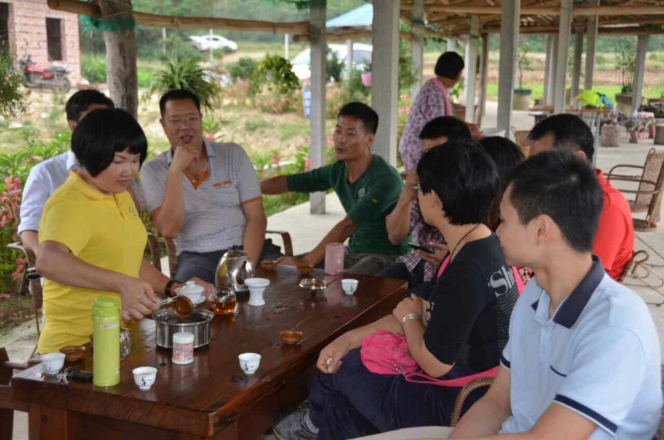 沿着小径,左边是一排休闲长廊,里面摆设了各式品茶台,走廊种植了一排盛开的指甲花,娇艳欲滴;右边是一地色彩斑斓的太阳花,点缀其中还有充满生机紫红色的月季花;再上就是开放式的饭厅、OK厅。来不及仔细欣赏,只见一位美女拿出精美的茶具,烧水泡茶,手法轻柔谂熟,经介绍,原来是茂名澜沧古茶的大姐大,雅称"梅姐",真是不显山,不露水,到处有名家。第一道是去年的古树冰岛,立即把大家带到遥远的茶马古道,那历经百年沧桑,依旧感受得到生机盎然的脉动,令人荡气回肠,满口余香。