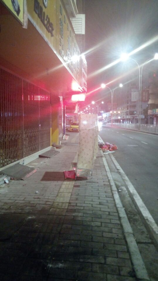 刚刚走路经过人民路,走到金悦对面的位置,哐当一声,一大坨东西从天而降,砸在我左手边,还好我走靠里面一点,不然肯定被砸中。 定了惊后仔细一看,像是一个布衣柜,底下是金属底,砸中不死都脱层皮。正好有辆摩托车经过,他还停下来跟我说了句:你真好彩,看着从你头上砸下来的。 回过头突然想起,前两三个星期的一个晚上,也是在那个位置,突然掉下一大包垃圾,里面装着玻璃瓶子,也砸在我脚边。当时以为是醉酒汉,在楼下骂了几句就走了。 如今细思极恐。这楼上大概住着个心理变态的家伙。 大家以后路过那里得小心。