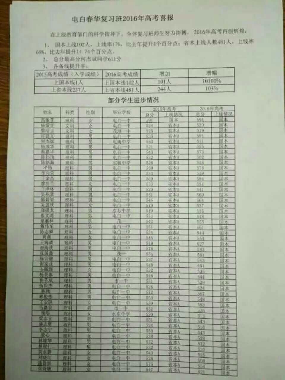 2016年普通高考考生上重点线432人,本科线以上3076人,专科上线人数9289。其中电白一中重点线340人,本科线以上1852人,专科线以上2990人。