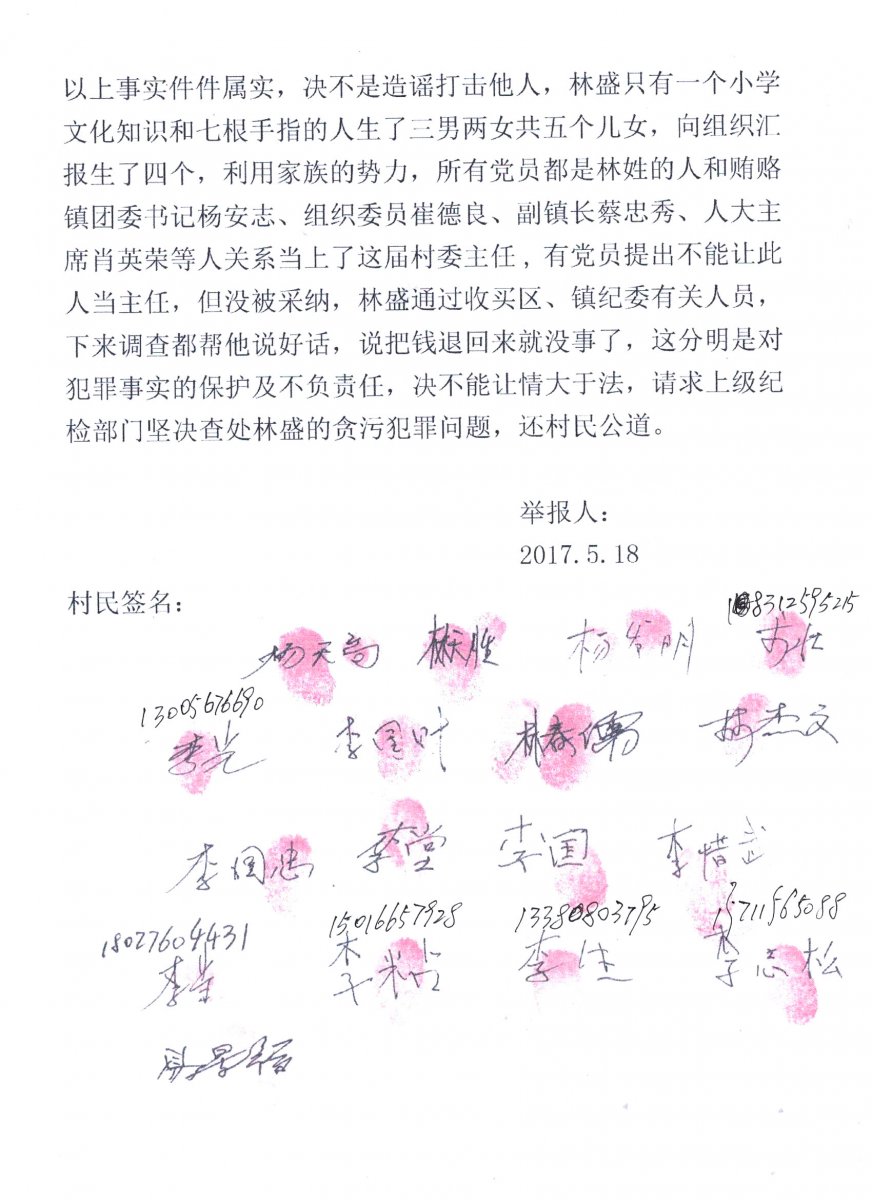 以上事实件件属实,决不是造谣打击他人,林盛只有一个小学 文化知识和七根手指的人生了三男两女共五个儿女,向组织汇 报生了四个,利用家族的势力,所有党员都是林姓的人和贿赂 镇团委书记杨安志、组织委员崔德良、副镇长蔡忠秀、人大主 席肖英荣等人关系当上了这届村委主任,有党员提出不能让此 人当主任,但没被采纳,林盛通过收买区、镇纪委有关人员, 下来调查都帮说好话,说把钱退回来就没事了,这分明是对 犯罪事实的保护及不负责任,决不能让情大于法,请求上级纪 检部门坚决查处林盛的贪污犯罪问题,还村民公道。