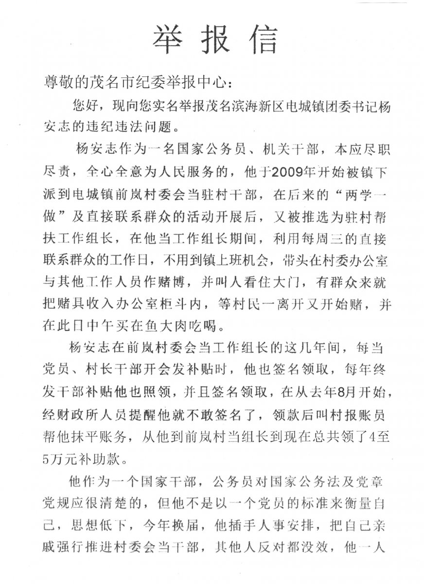 爆料 实名举报信两封——电城镇前岚村委员会那些令人发指的内幕!