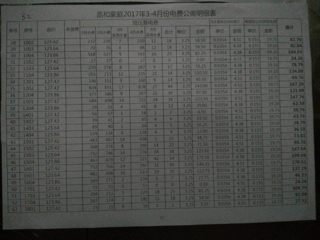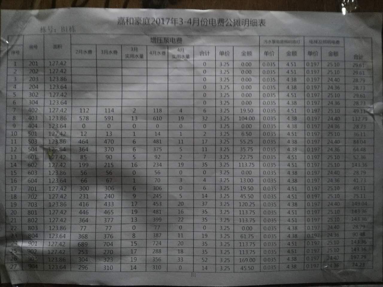 增压费3.25元/立方,意思是增压泵把水加压给住户需要3.25元/立方,骇人听闻!有些业主的公摊费就比物业管理费高了,这就是嘉和豪庭!