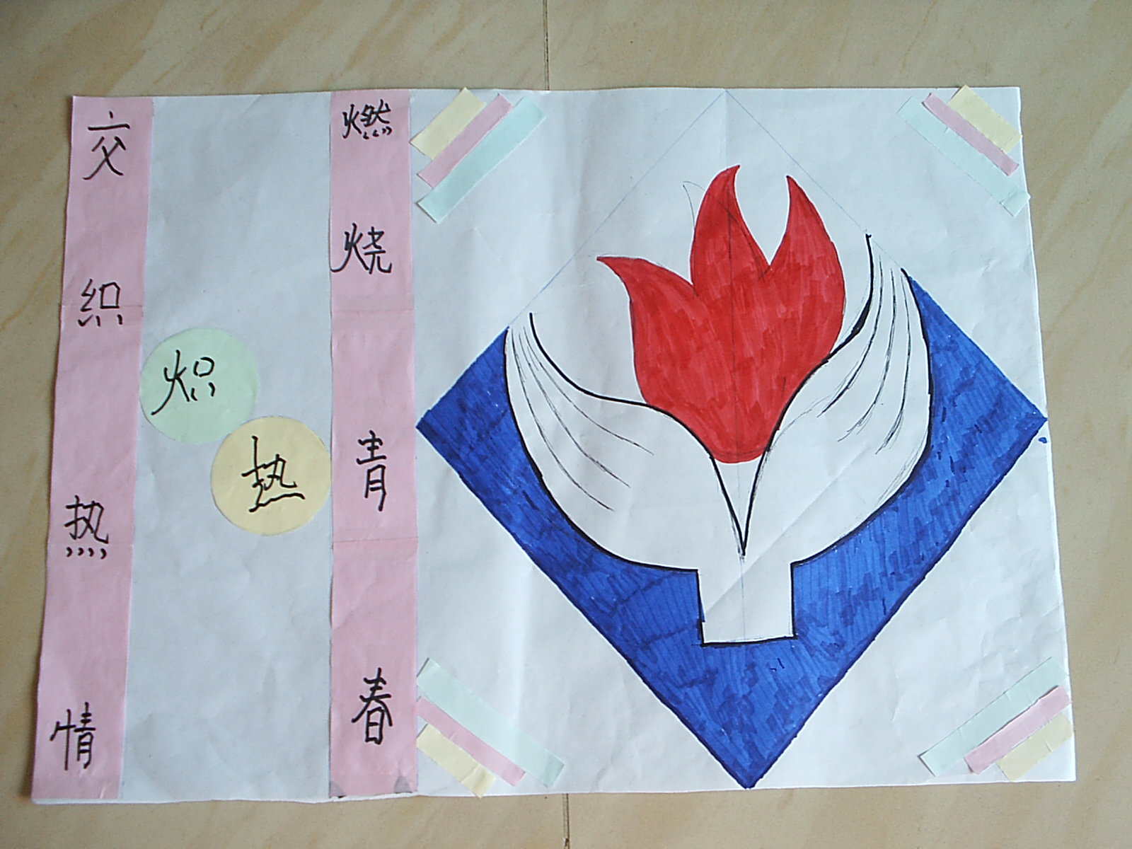 上面那张是其中的一个小组在一个多小时内完成的队旗,同时完成了队名、队呼、队歌和十全十美掌声的创作,他们是炽热队。