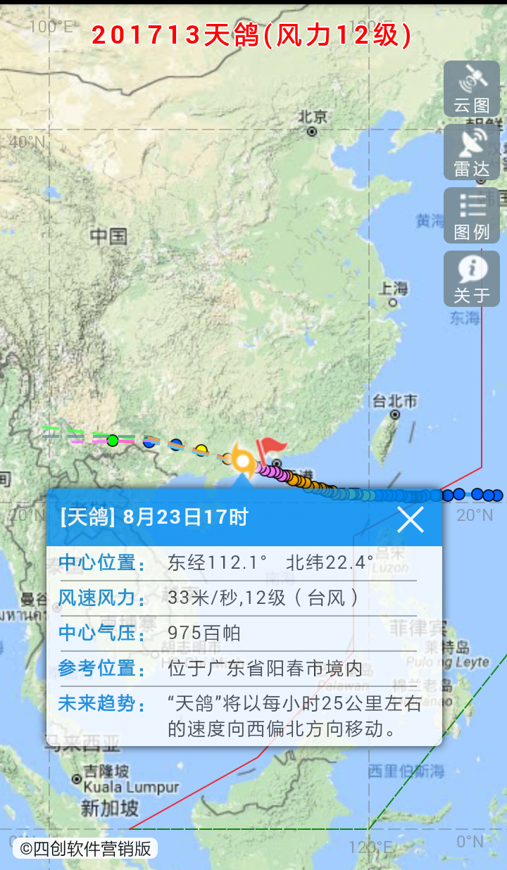 W wdfb 荣誉主席 注册 2005-09-04 消息 9,729 反馈评分 297 点数 191 2017-08-23 #3 预计,“天鸽”将以每小时25公里左右的速度向西偏北方向移动,强度继续加强,并将于23日中午前后在广东珠海到阳江一带沿海登陆(40-48米/秒,13-15级,台风级或强台风级),登陆后继续向偏西方向移动,强度逐渐减弱,23日晚上将移入广西境内(30-33米/秒,11-12级,强热带风暴级或台风级)。