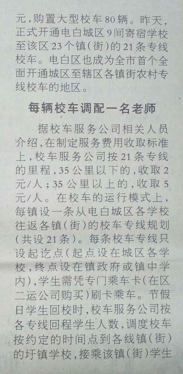 BBQ2006 研究生 注册 2006-07-05 消息 1,198 反馈评分 1 点数 61 2017-08-31 #32 该区结合全区城乡公交一体化工作,构建以区内短途客运为主校车为辅的学生疏运格局,尽力满足城区学校寄宿学生乘车需求,保证学生上下学的交通安全。按周末等节假日分批次错峰放假学生的运送量估算,线路里程较长的爵山、岭门、霞洞等12个镇的12条专线运送3趟;线路里程中等的树仔、麻岗等镇4条专线,运送4趟;线路里程最近的七迳(坡心)、小良、南海(高地)等5条专线,运送5趟。逢周末等节假日,由城区各学校提前统计、登记好本学校返回各镇(街)的学生人数报校车服务公司。校车服务公司按各学校返回各镇(街)的学生人数,调度相应数量的校车到各学校门口指定位置搭乘学生,直达相关镇圩、镇学校,沿途不设上下车;由区教育局统一安排每辆校车调配一名跟车教师,随车对学生进行全程管理教育,各镇中心学校在各镇乘车点派出一名教师协助学生乘车。 在确定校车服务公司上,该区政府决定由区城市交通建设投资集团有限公司和区第二运输公司承担提供水东城区寄宿学校学生周末等节假日返乡回校的校车服务。在购置全新校车上,由区城市交通建设投资集团有限公司融资采购的方式购置大型80辆校车,委托区第二运输公司管理和经营,运营过程中收支不足的部分由区财政局进行政策性的亏损补贴。在实施校车准入制度上,配置的校车严格按照校车使用许可的程序办理。在制定服务费用收取标准上,校车服务公司按21条专线的里程,35公里以下的,收取2元/人;35公里以上的,收取5元/人。在明确安全管理责任上,学校与校车服务公司签订校车安全管理责任书,明确各自的安全管理责任,落实校车运行的安全管理措施。在校车的运行模式上,每镇设一条从电白城区各学校往返各镇(街)的校车专线规划(共设21条)。每条校车专线只设起讫点(起点设在城区各学校,终点设在镇政府或镇中学内),学生需凭专门乘车卡(在区二运公司购买)刷卡乘车。节假日学生回校时,校车服务公司按各专线回程学生人数,调度校车按约定的时间点到各线镇(街)的圩镇学校,接乘该镇(街)学生回校。未满载的,可在沿线接乘学生。