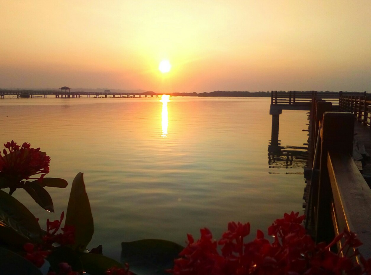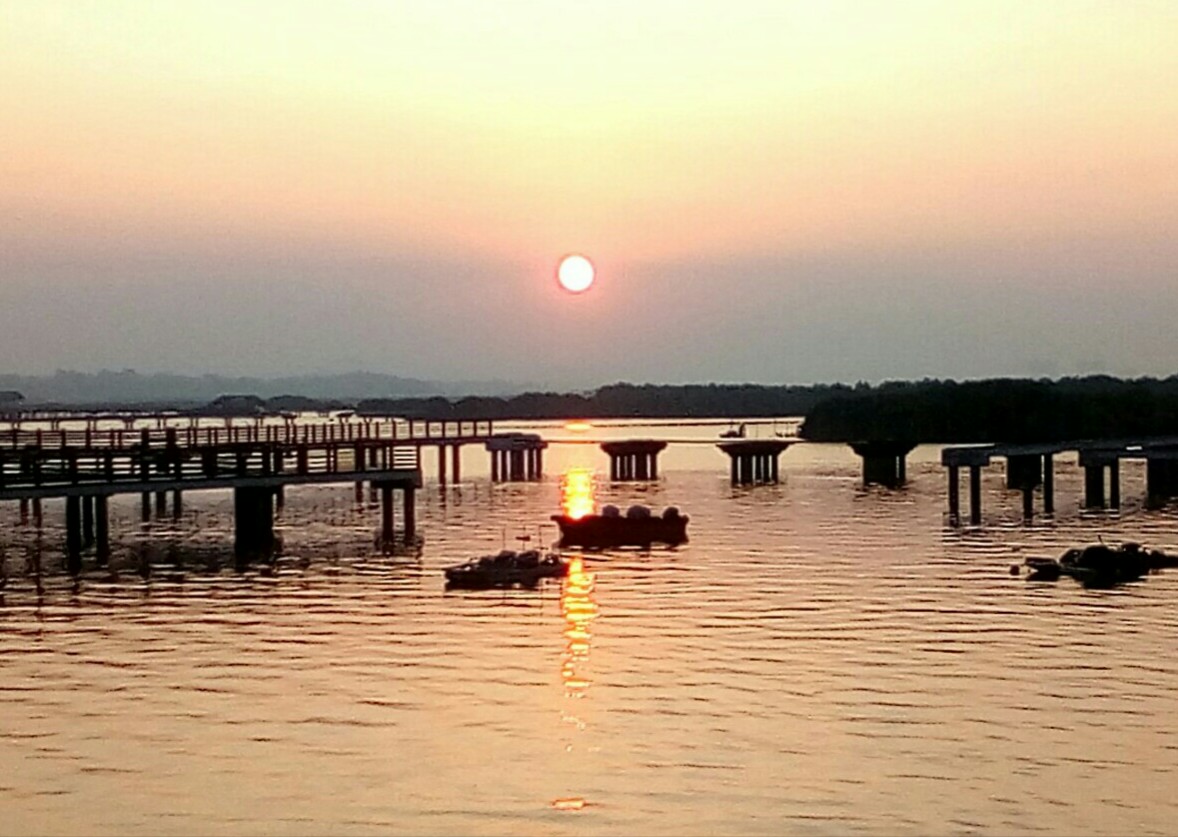 很美栈道就是红红火火的红色嘛,如身在其中,发挥下想像力嘛,天是蓝,水与红树林是绿,栈道是红,晨早与傍晚在红太阳照耀下就是红色嘛