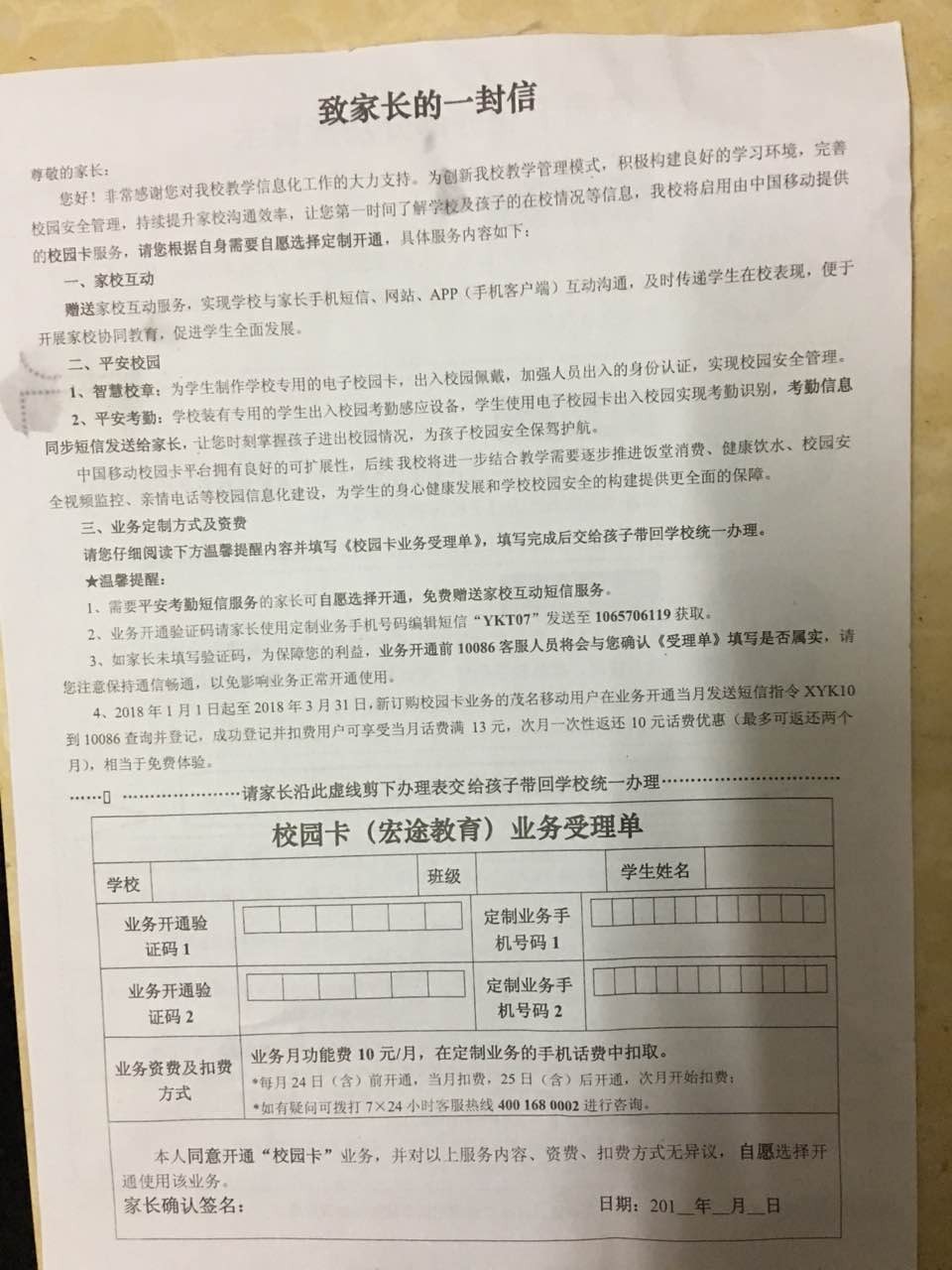 由于有小孩在校读书,当时联系方式上留下了手机号,好了,从此每星期一中国移动就发信息来要求开通校讯通,每个月十元,每次不予理会,我想,现在班级微信群也有了,根本就没必要用这个要花钱的拉圾通,我想不出它什么存在的理由,唯一的理由就是刮每一用户每一月十元,统计下来那是一笔可观的收入啊。难怪学校也那么积极动员家长们要开通,还特别交侍是务必要开通。。。没猫腻才怪。