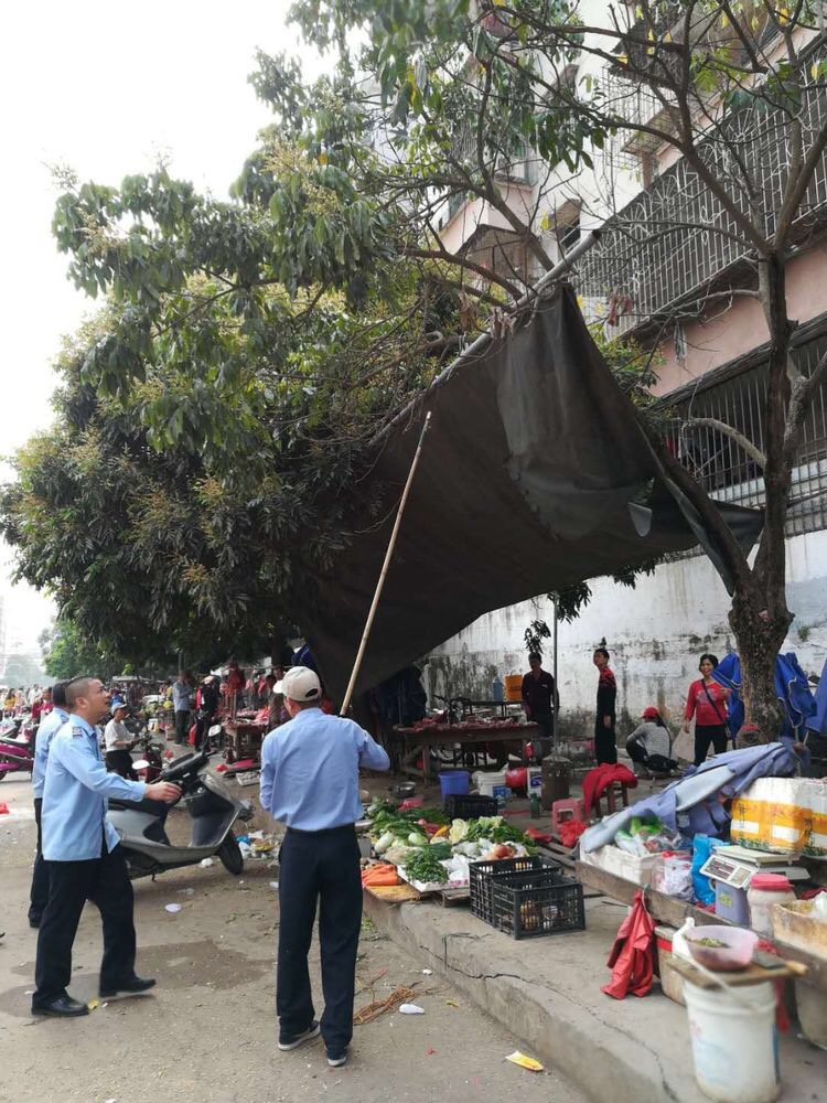 城管蜀黍你们好!建议你们参考广州市天河区棠下街道的做法,电白城管在电海中学围墙边(树下)设置流动摊贩临时疏导区,不能让他们摆到路上。