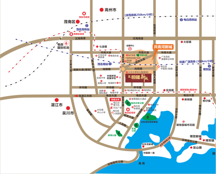 本项目位踞迎宾大道,共青河新城和水东湾新城的交汇点,进可快速到达共青河新城、市民大道片区,退可深入水东湾新城腹地;茂名申办省运的主场馆,奥体中心(规划)将落居共青河新城;水东湾新城被列入广东八大湾区。两城交汇,繁华无限,得恒隆一席,得未来!