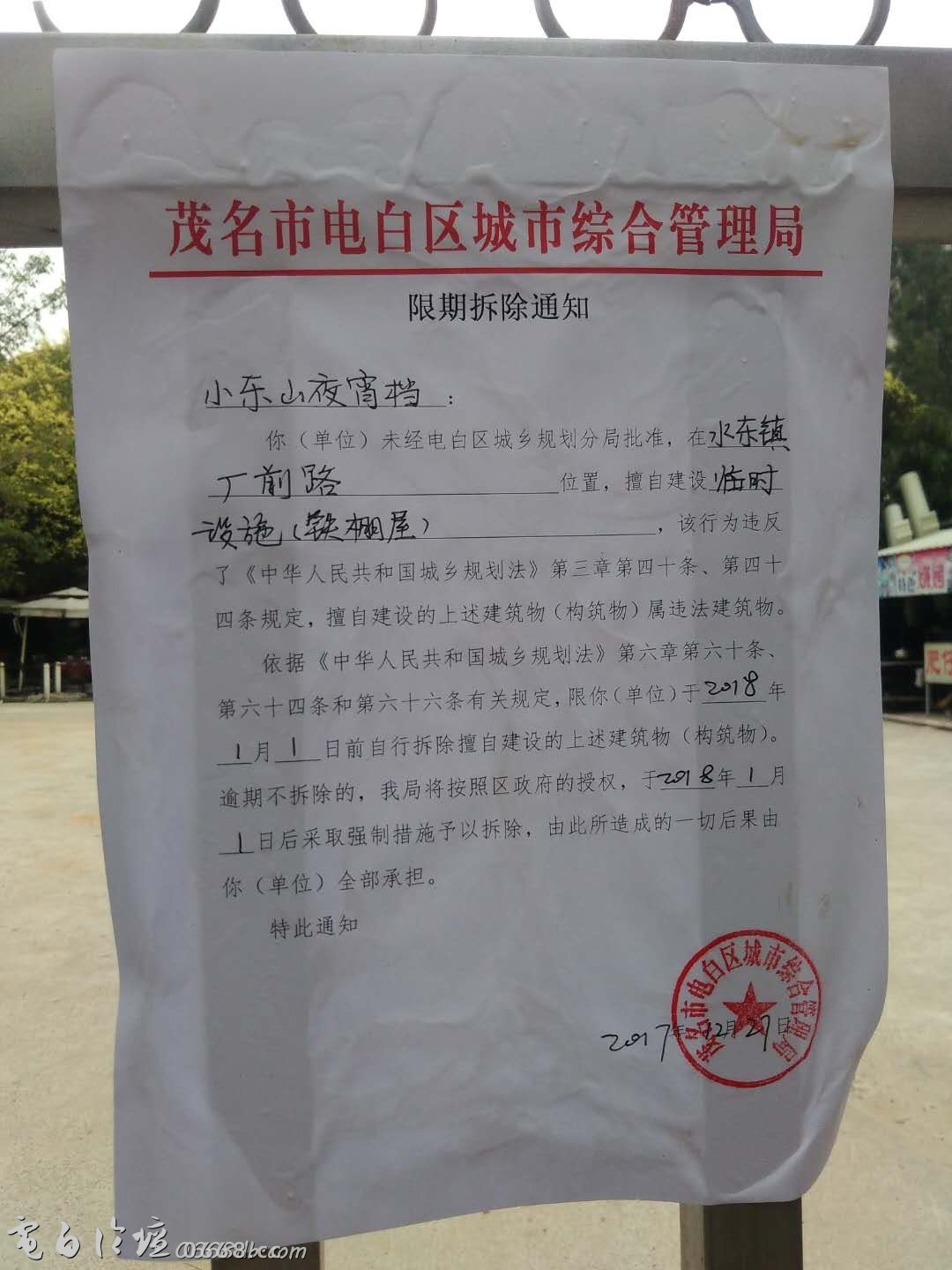 公告大概是以这些建筑违反了未报建批准,影响了城市扩展和市容市貌。这一条来处理拆除水东镇广隆岭,有二、三十年纠纷土地上的建筑。这样做不公平,难以服众。二十年前有多少座民房报建的?所以我认为这个公告也是拆不了这个建筑。政府部门三次发出通知书,第一区城管局2017.12.27发巜限期拆除通知书》。第二市城乡规划局2018.4.8发巜限期拆除事先告知书》。第三区人民政府2018.5.22发巜茂名市电白区人民政府通告》从这三个巜通知书》、巜告知书》、巜通告》来看政府部门是想解决这个问题,但是方法上一错再错,首先发巜通知书》的城管局是不可能处理农村问题的。期次发巜告知书》的城乡规划局是2018年成立的更不可能处理历史问题。第三发巜通告》的区政府怎么能发出通告说要拆别人二、三十年前没有报建的房子?那其他的没报建的要不要拆?我们就坐等看区政府的笑话吧!