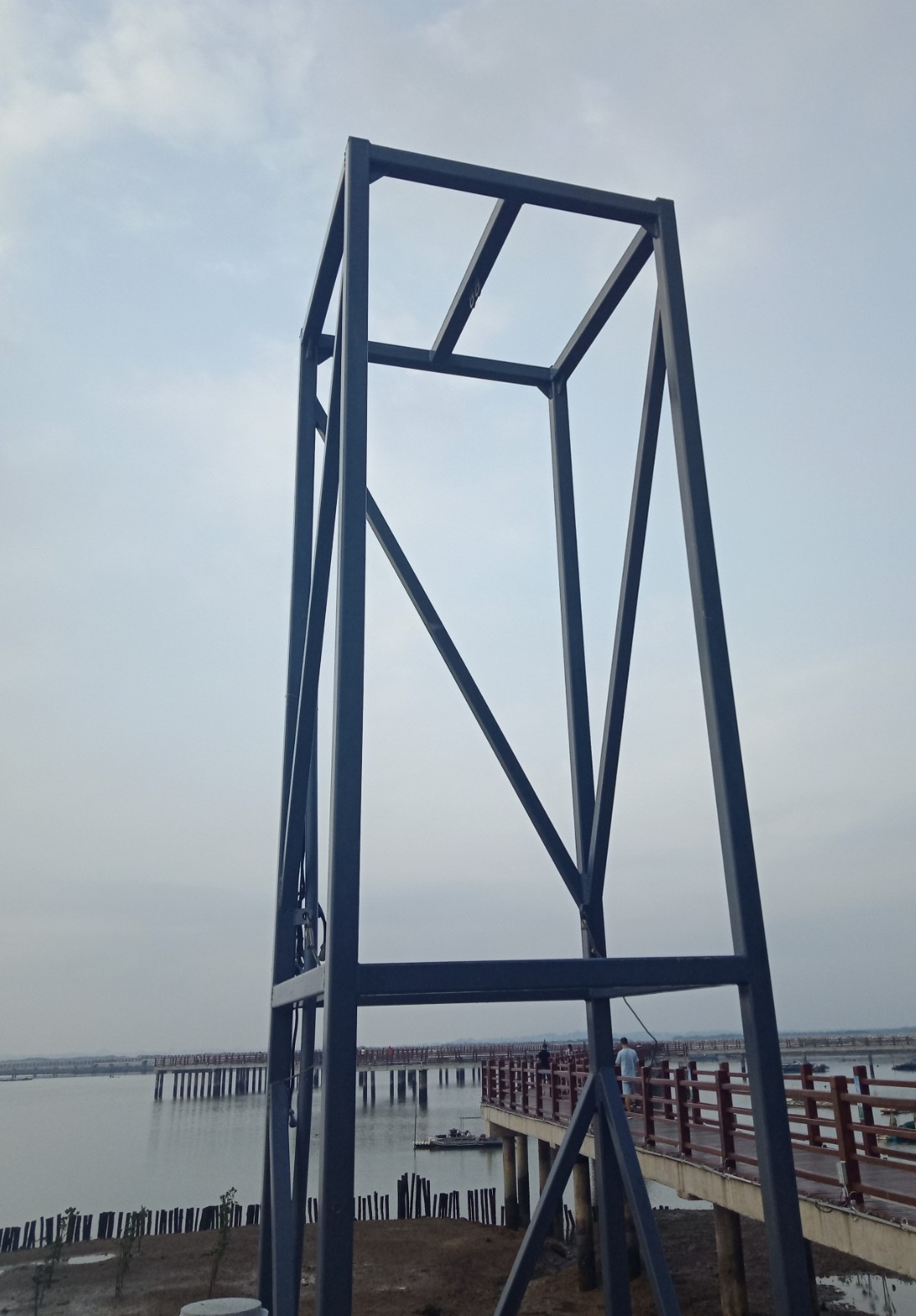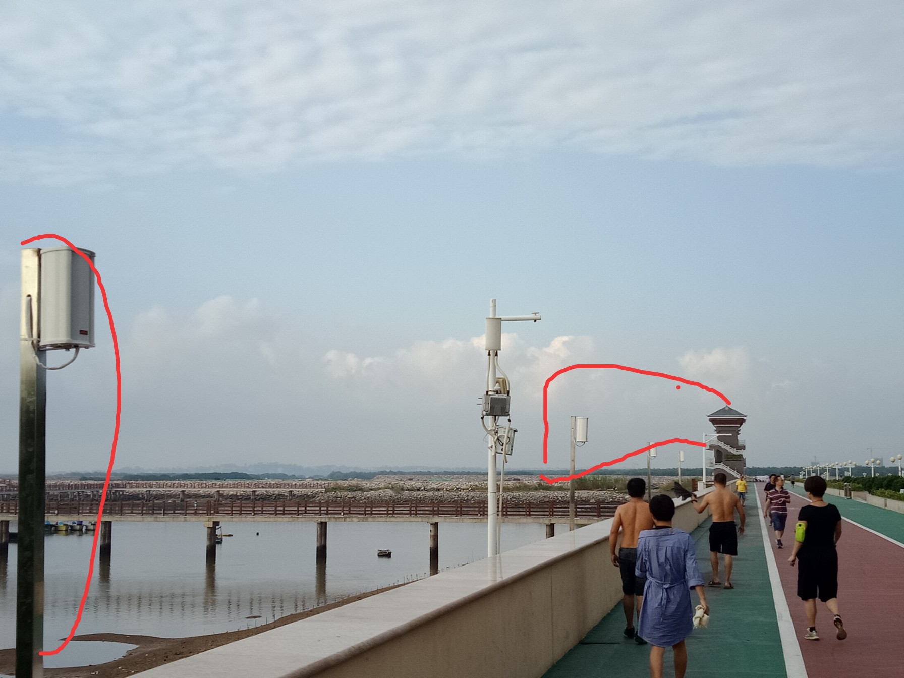 这晚再去吸吸,貌似是装音箱,在观鸳阁这边笫一进出栈道口~至亲水平台,而那边也早己装好音箱~至那边的进出栈道口~早时,只有向海滨大桥那边有柔和的音响,而观鸳阁这边冇声音~先去逛几圈稳下食,过开晚点再来吸吸,依有音乐发出声哦~