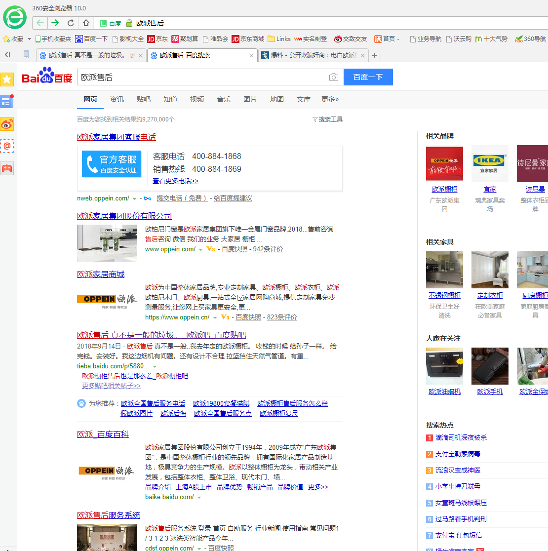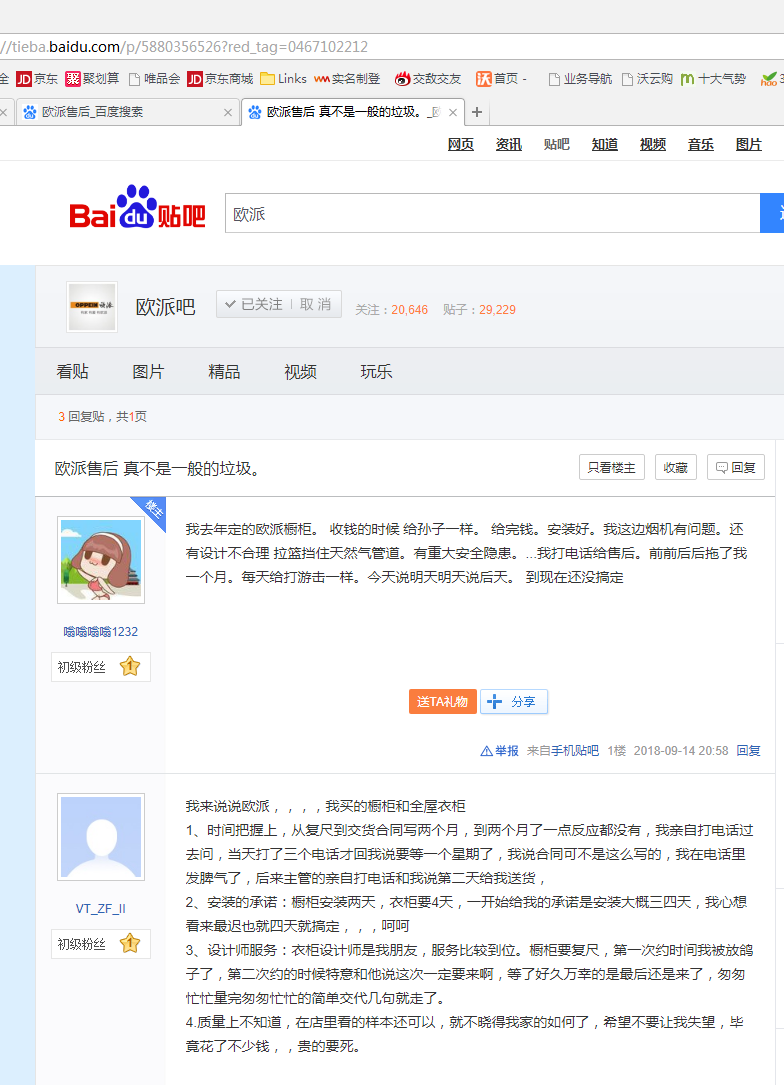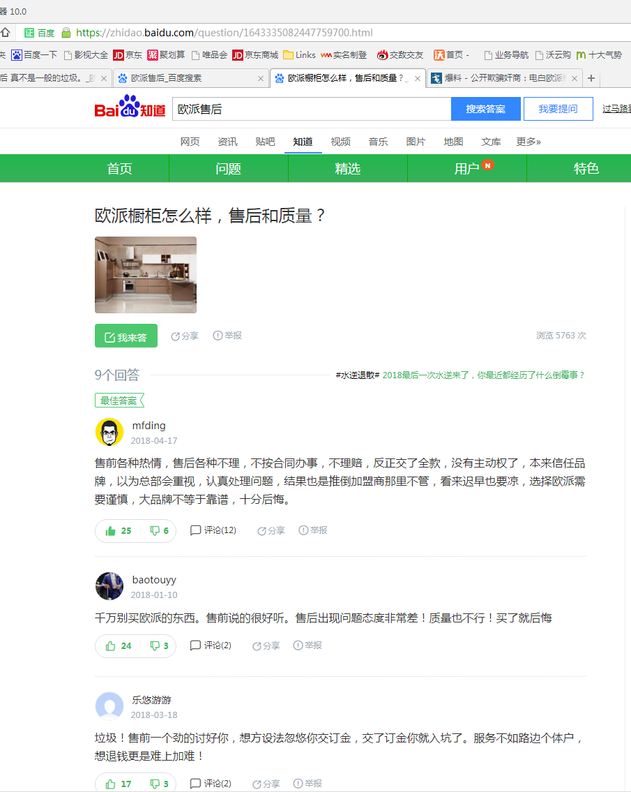 近期在网上查找了一下,发现关于欧派橱柜问题的贴子真的很多,看来是很多人都中招的了!!大家要小心上当,别让大品牌的外表蒙住了眼!我的情况并不是个个案,更多的只是我们没发现,但确实是存在的事实!