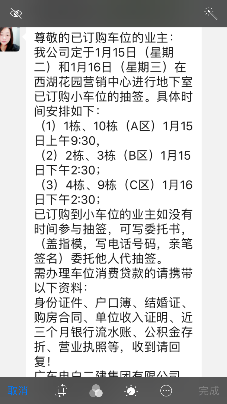 刘二哥 说: 本人在2016年上半年购买由广东电白二建集团有限公司开发的西湖花园商品房,并在当年签署了购房合同并在电白区房管局网签,合同约定在2017年6月30日前交房,时至今日都没有收到开发商正式收房通知书,开发商已经逾期违约了1年多,现在去小区观看目前出现了有些业主入住,听到一些入住业主讲到,当年购房合同签约物业管理公司有更换,电梯由西门子变成所谓的西德西门子,小区配套地下停车位强卖,如果不在开发商处花高价16万人民币购,将无处停放车辆。管道天然气收费2400元1户,电白发改委曾发出通知,商品房售价包含了天然气管道的费用,现在开发商单面收取,投诉到政府部门没没得到处理, 点击展开...