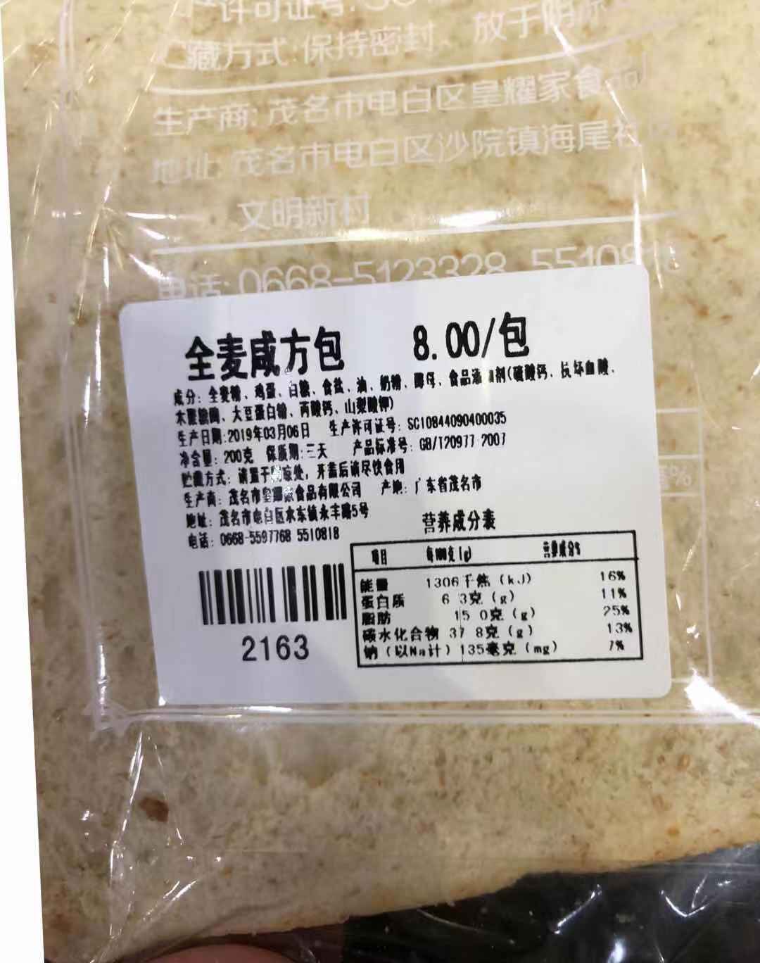 内 内楼道1 幼儿园 注册 2019-03-07 消息 3 反馈评分 0 点数 0 2019-03-07 #1 于2019年03月06日在皇耀家海滨店购买了一包全麦切片咸面包,价格8元,保质期三天。今天一看,意外发现面包出现变质,皇耀家在当地较为知名面包店品牌,所售食品竟然在生产日期第二日变质,令人咤舌。该食品本是禁止上架销售,为何会出现在销量架上?这一现象已充分暴露了皇耀家在食品安全上的忽视。希望食品监管单位等相关部门严查该店的食品加工经营资质和该批面包的进销货手续。还市民一个安全放心的食品消费环境。 附件 微信图片_20190307225036.jpg 92.1 KB · 查看: 1,259 微信图片_20190307225239.jpg 87.2 KB · 查看: 1,177