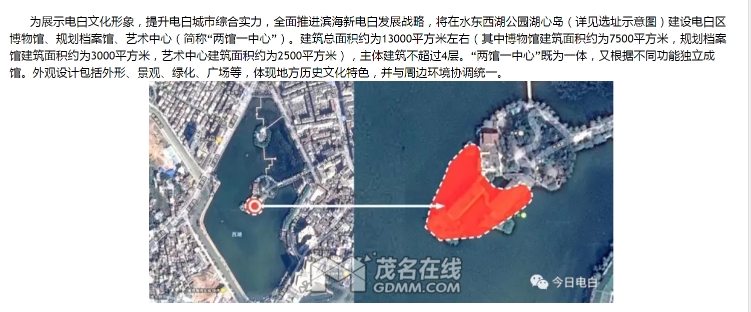 绿城风景 说: [FONT=仿宋]根据大型人群聚集公共活动场所,消防安全,突发事件应急处理的有关管理规定,[/FONT][FONT=仿宋]电白区两大人群聚集的大型公共活动场馆,图书馆,慱物馆,不适合建在巴掌大的西湖岛上!如果发生消防安全,突发事件,不利于珍贵文物,书籍,古典的及时抢救转移,也不利于人员疏散和有关应急,消防车辆出入。如果一定执意建在西湖,是不是可在西湖角建,小占地做高几层,做成市民活动中心。[/FONT] 点击展开... 公园与书馆相衬托,湖水与楼阁相辉映,曲桥与行人牵手,绿道与绿水相连接,拱桥流水淙淙,四面环湖春暖花开,绿树成荫,建设好了风景就大不一样,现在也许还未看到……等待吧,岁月经不起太长的等待!