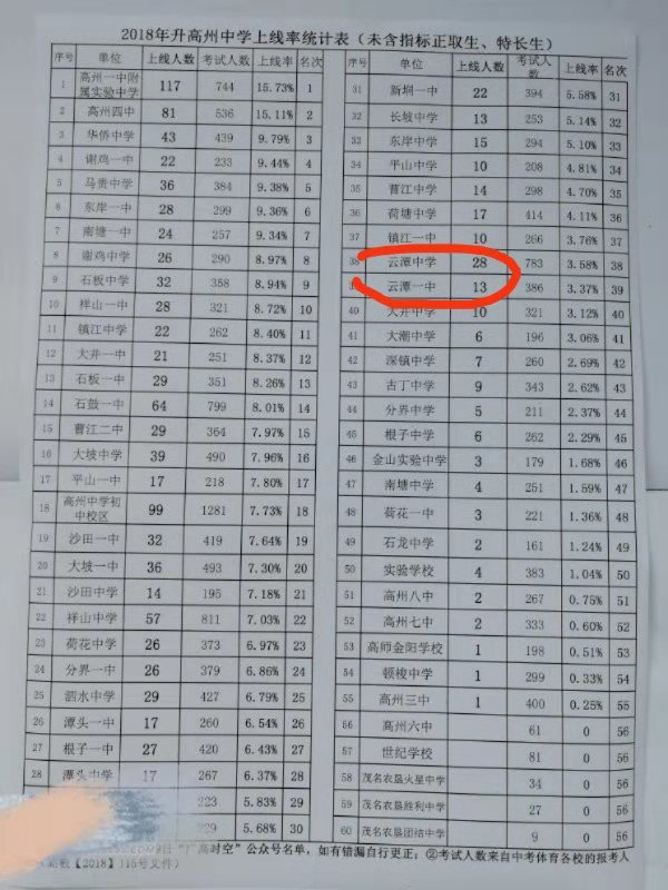818 小学一年级 注册 2012-06-10 消息 135 反馈评分 6 点数 1 2019-07-01 #7 梦想归来 说: 校长如果不能调动尖子班的任课教师的积极性,乡镇的尖子班也不怎么样,质量也好不了。高州的乡镇中学都不错,尤其是云谭中学和谭头中学,是乡镇中学的领头军,两间都是离高州最远的中学。一个学校的教学质量好不好,关键在于校长。 点击展开... 能不能不拿其他地方的学校来做参考呢?这样对本地区招生百害无一利,也不存在参考价值!再说你提到的那个云谭中学在高州是很差水的学校,并不是你所说的什么乡镇领头军(请看中考数据),请不要误导了山区片家长!那霍中学,观珠中学,电白六中并不比云谭中学差 附件 1.jpg 108.2 KB · 查看: 779