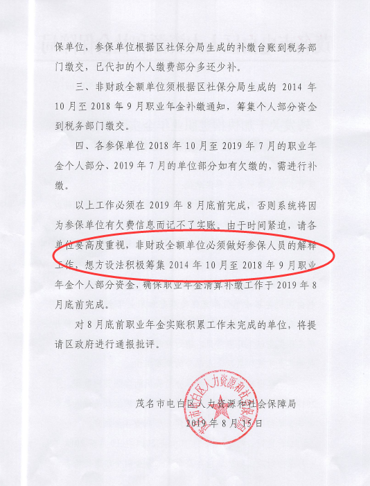 一、今天接到单位通知,医院所有在编人员要补交五年左右个人职业年金(平均每人要交六千多,不少职工一个月工资就三四千等于两个月生活费没有了),而且是这几日内马上要补交,否则就责任自负很严重之类。疑问1,为什么以前没通知过要交职业年金,现在一交 就是五年六千多。疑问2,同样是电白编制人员,为什么其他各单位都有财政拨款补交这次职业年金,唯独卫生线上千职工要个人补交那么多而且是要立马补交否则就后果自负。卫生线社保退费工作各单位部门都基本完成,又是卫生线至今为“0”,没有任何一间医院 完成,现在却要所有医院马上补交职业年金。