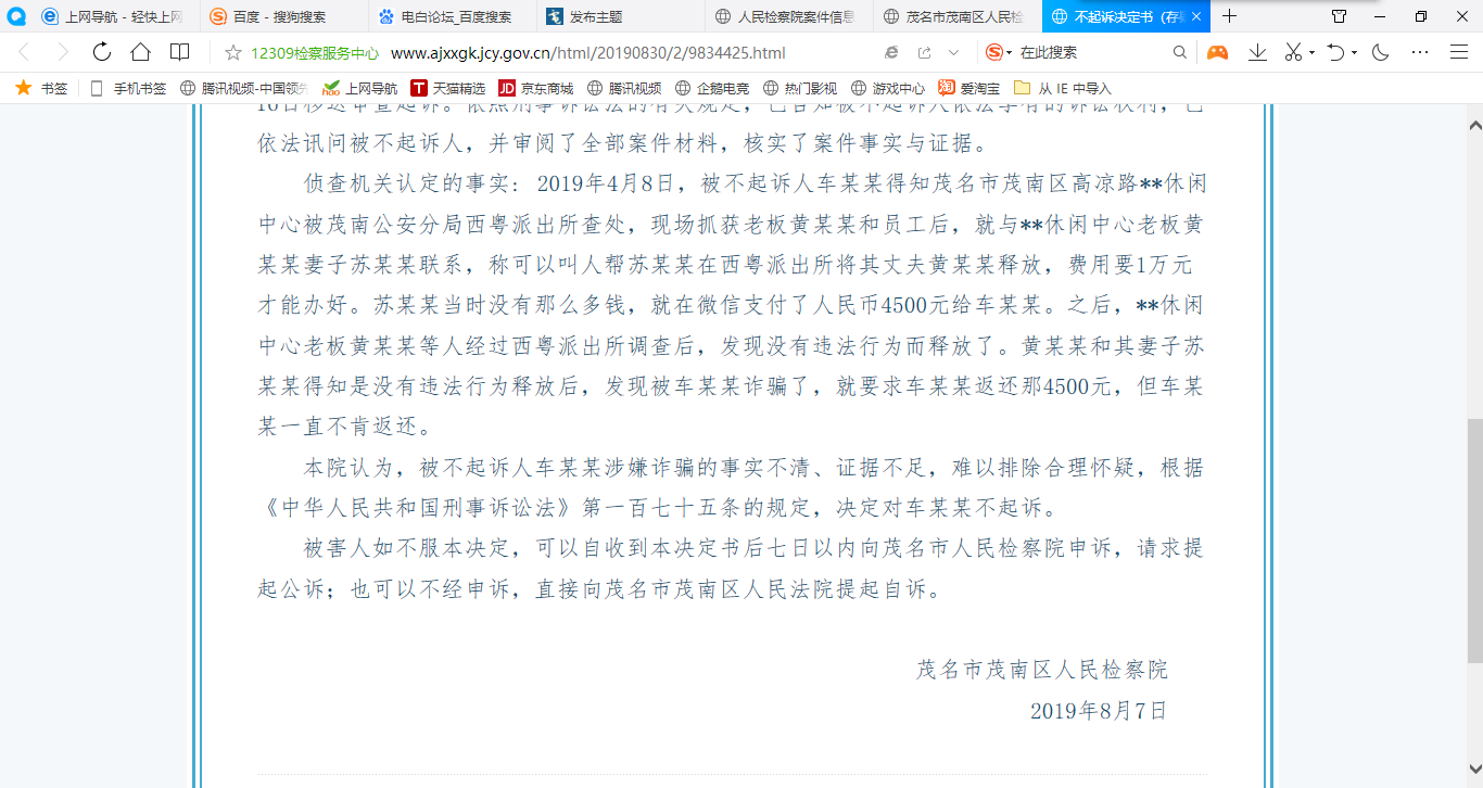 爆料 茂名高凉路一休闲中心老板老婆涉嫌被诈骗4500元,结果检察院对嫌犯不起诉,详情请看,案件扑朔迷离 (1人在浏览)